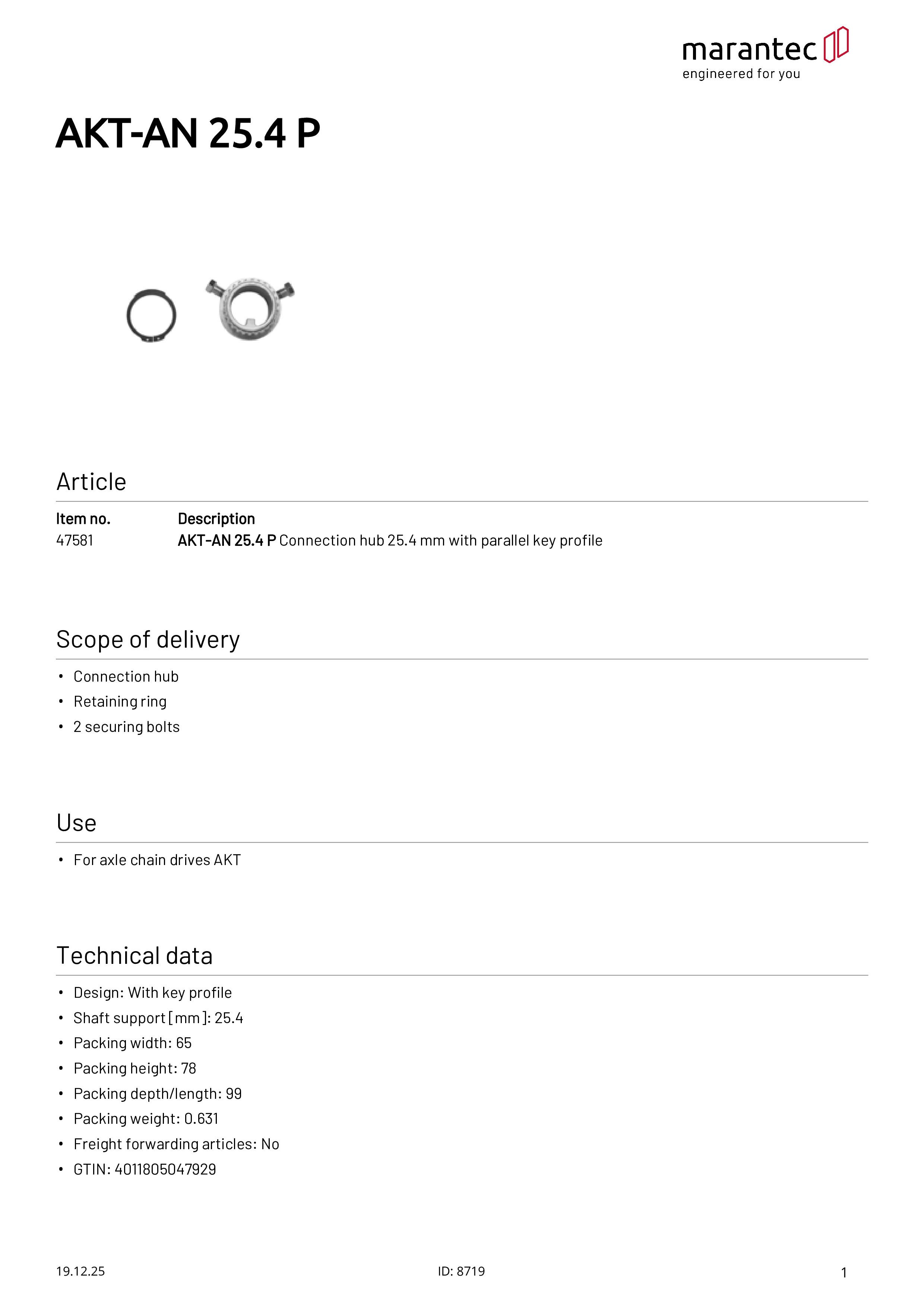 AKT-AN 25,4 P Moyeu de raccordement 25,4 mm avec profil de clavette