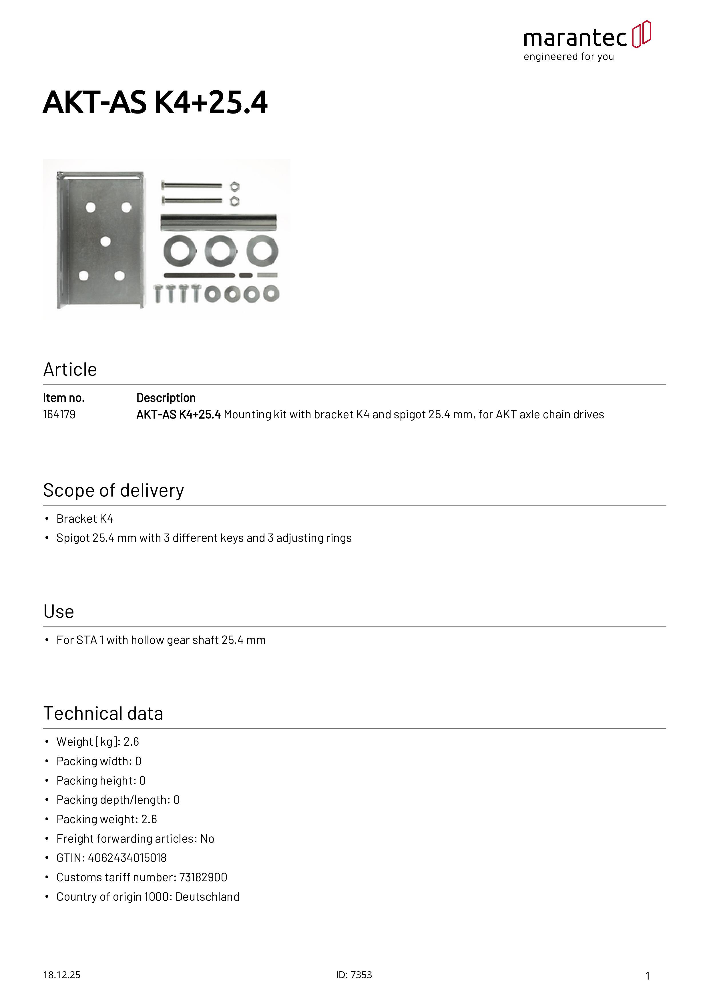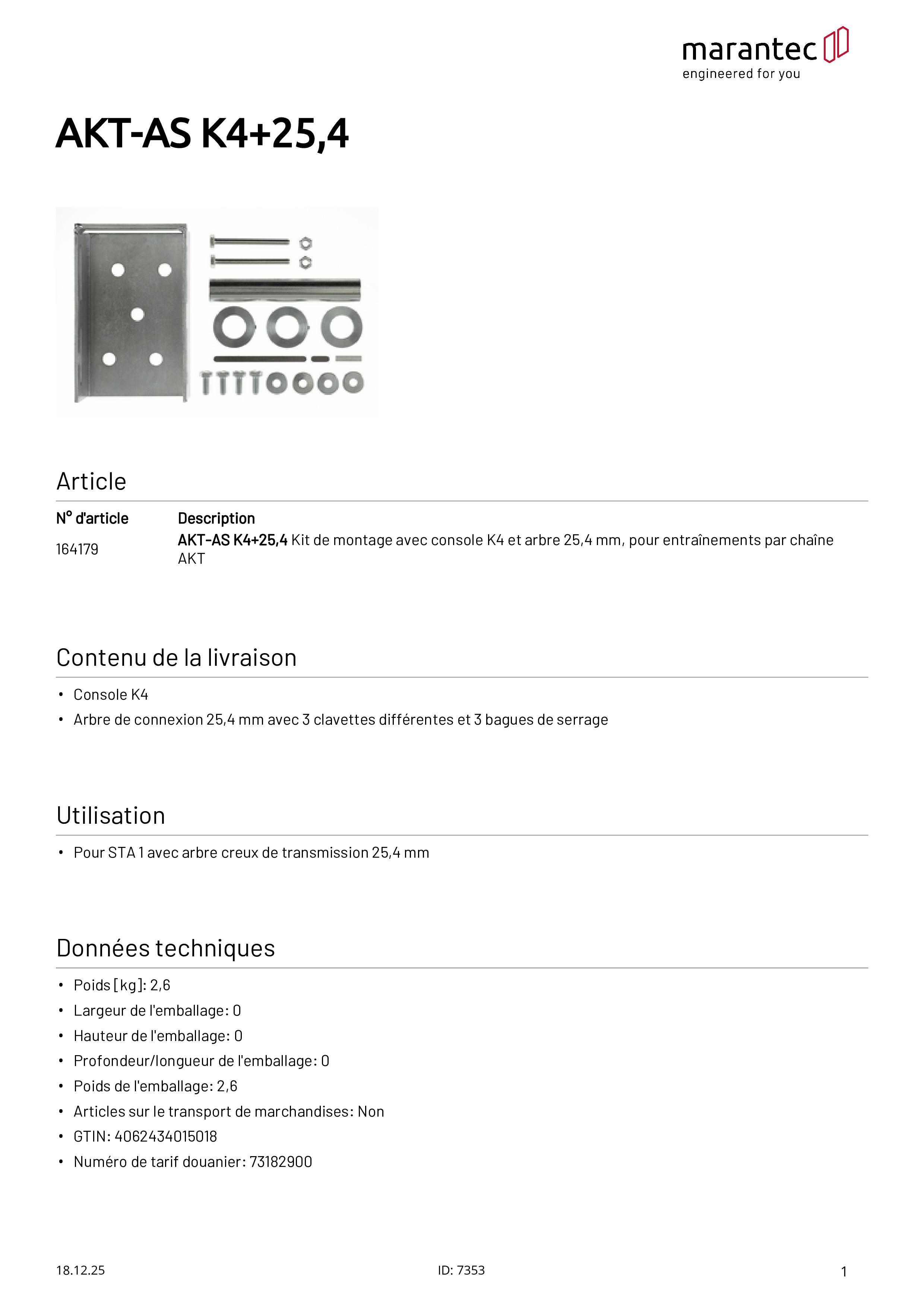 AKT-AS K4+25,4 Kit de montage console K4 et arbre enfichable 25,4 mm pour système de transmission