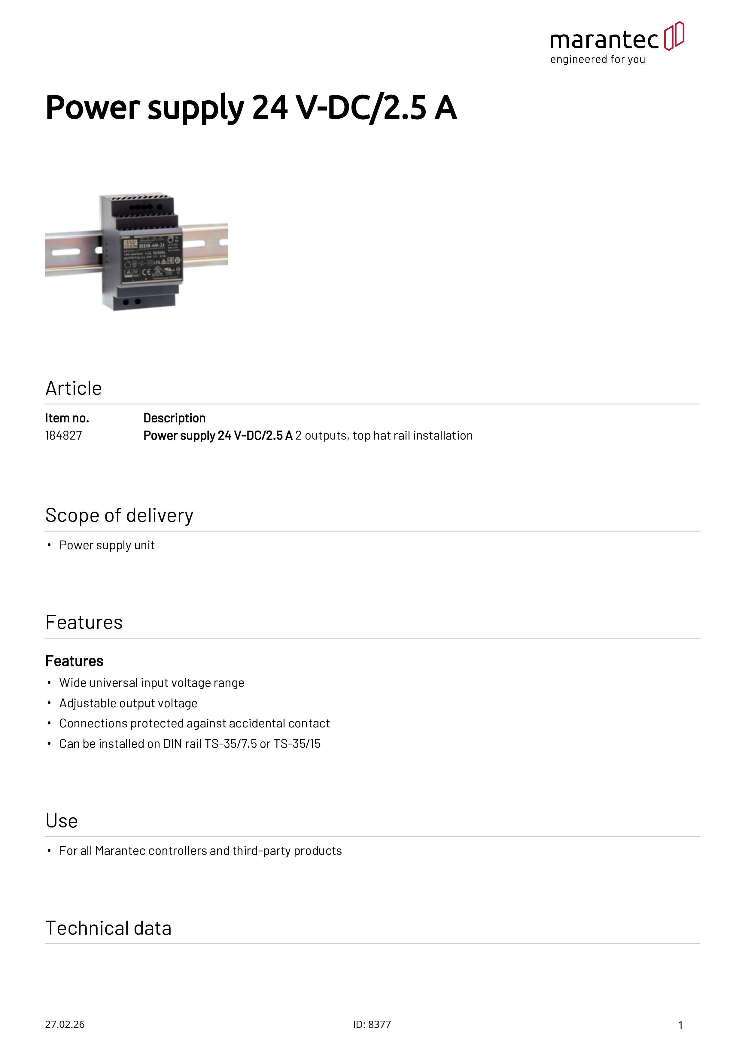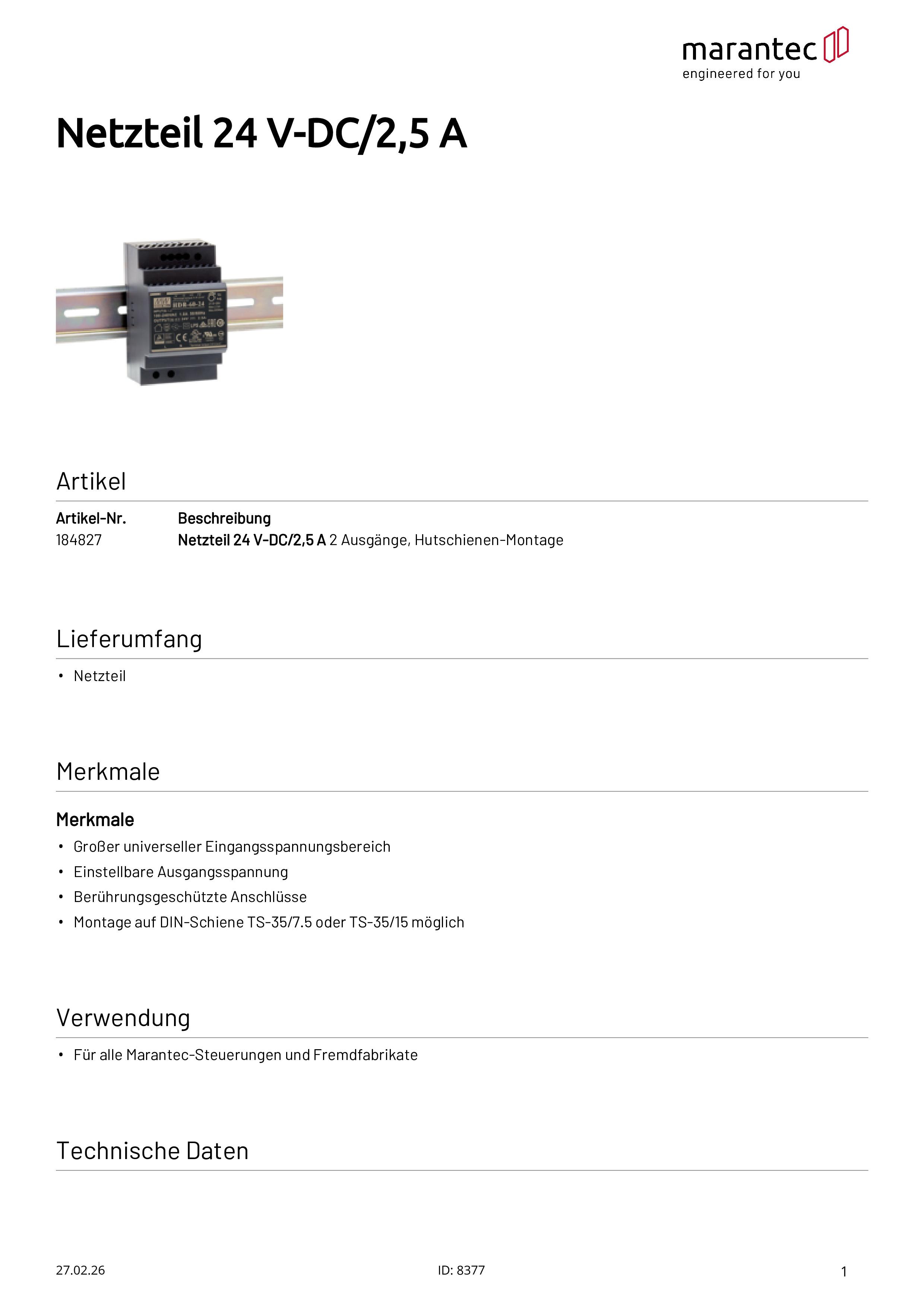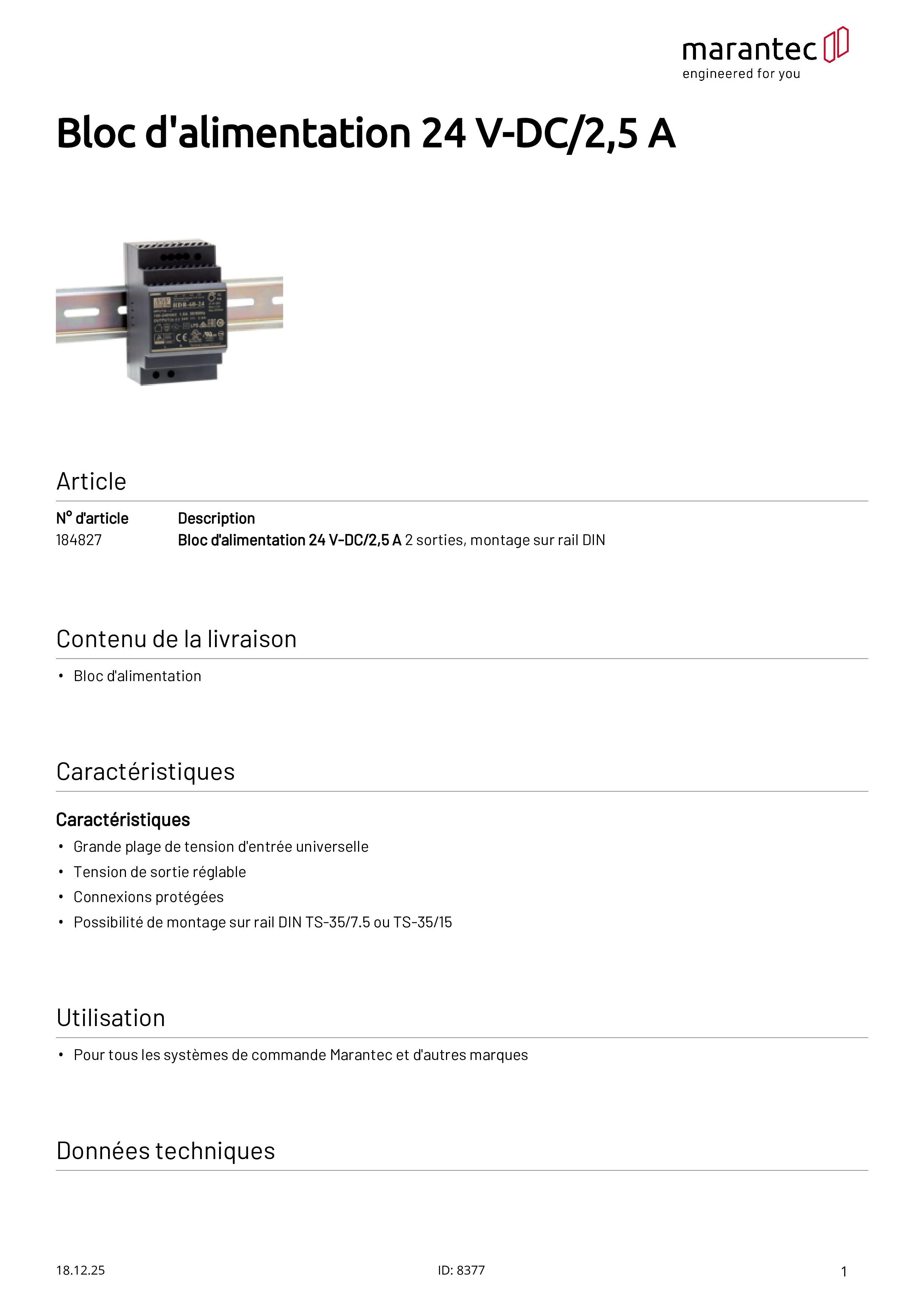 Bloc d'alimentation 24 V-DC/2,5 A avec 2 sorties, montage sur rail DIN