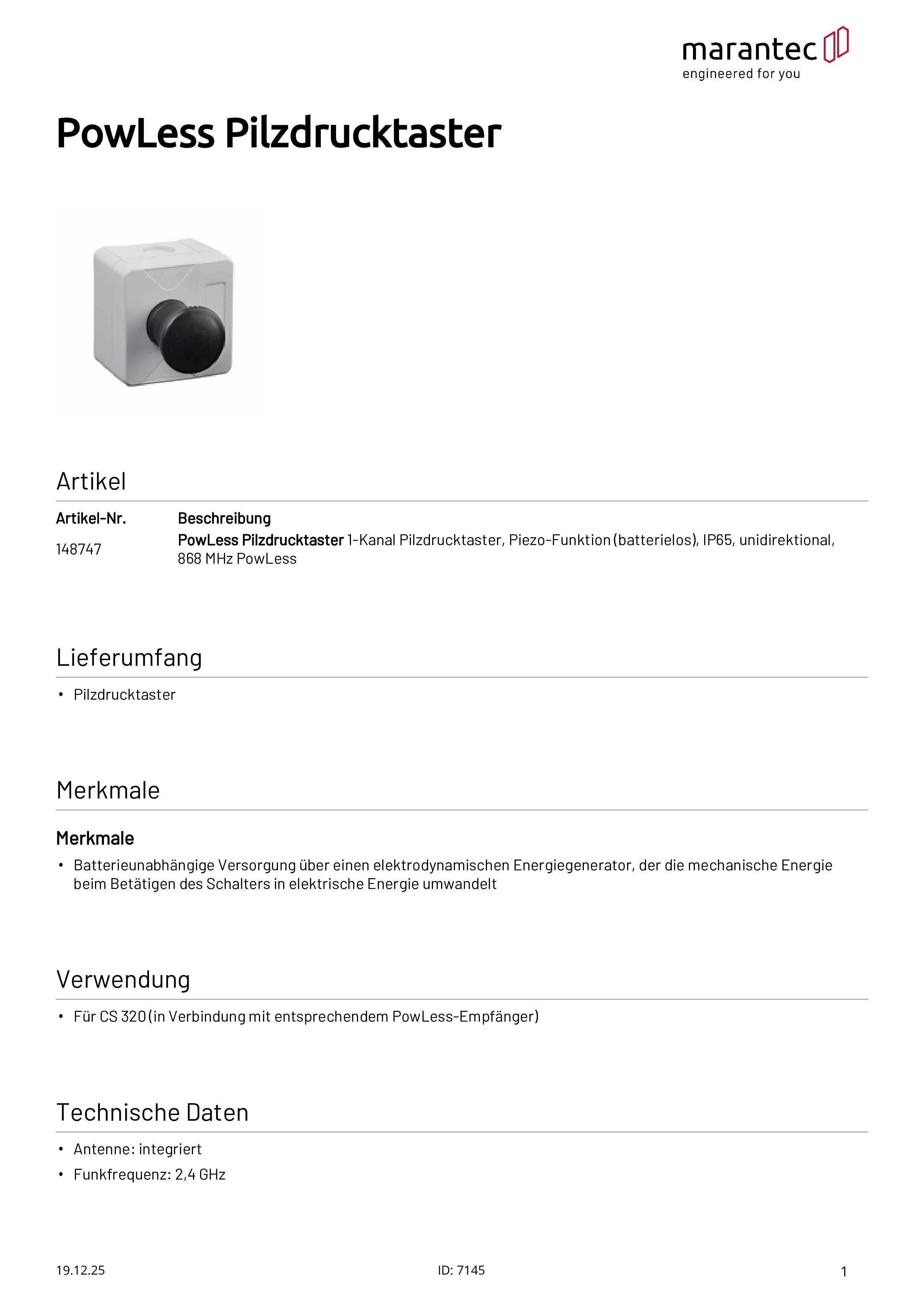 PowLess Bouton-poussoir coup de poing, fonction piézo (sans pile), IP65, 868 MHz PowLess