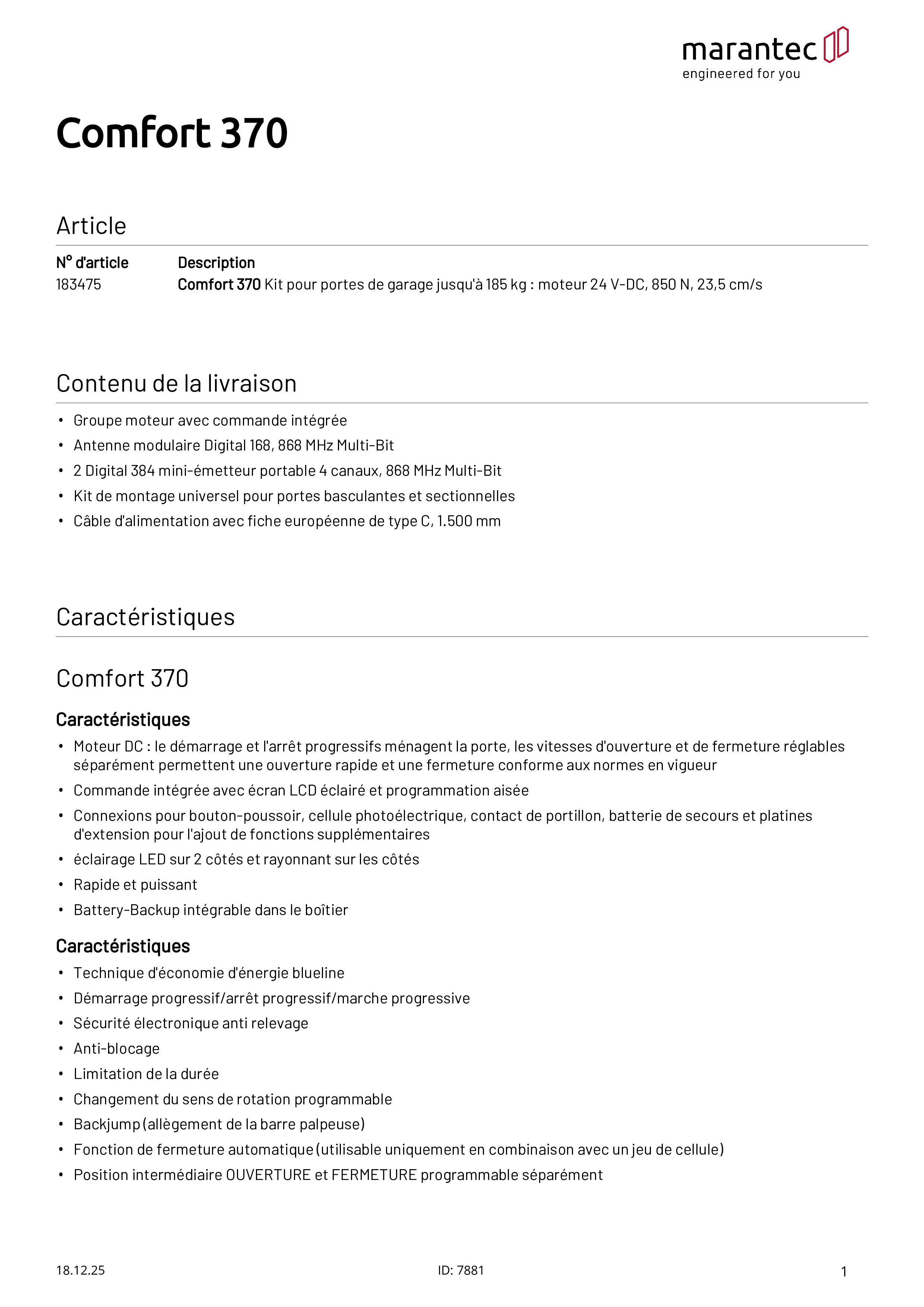 Comfort 370 Motorisation de portes de garage 868 MHz Multi-Bit