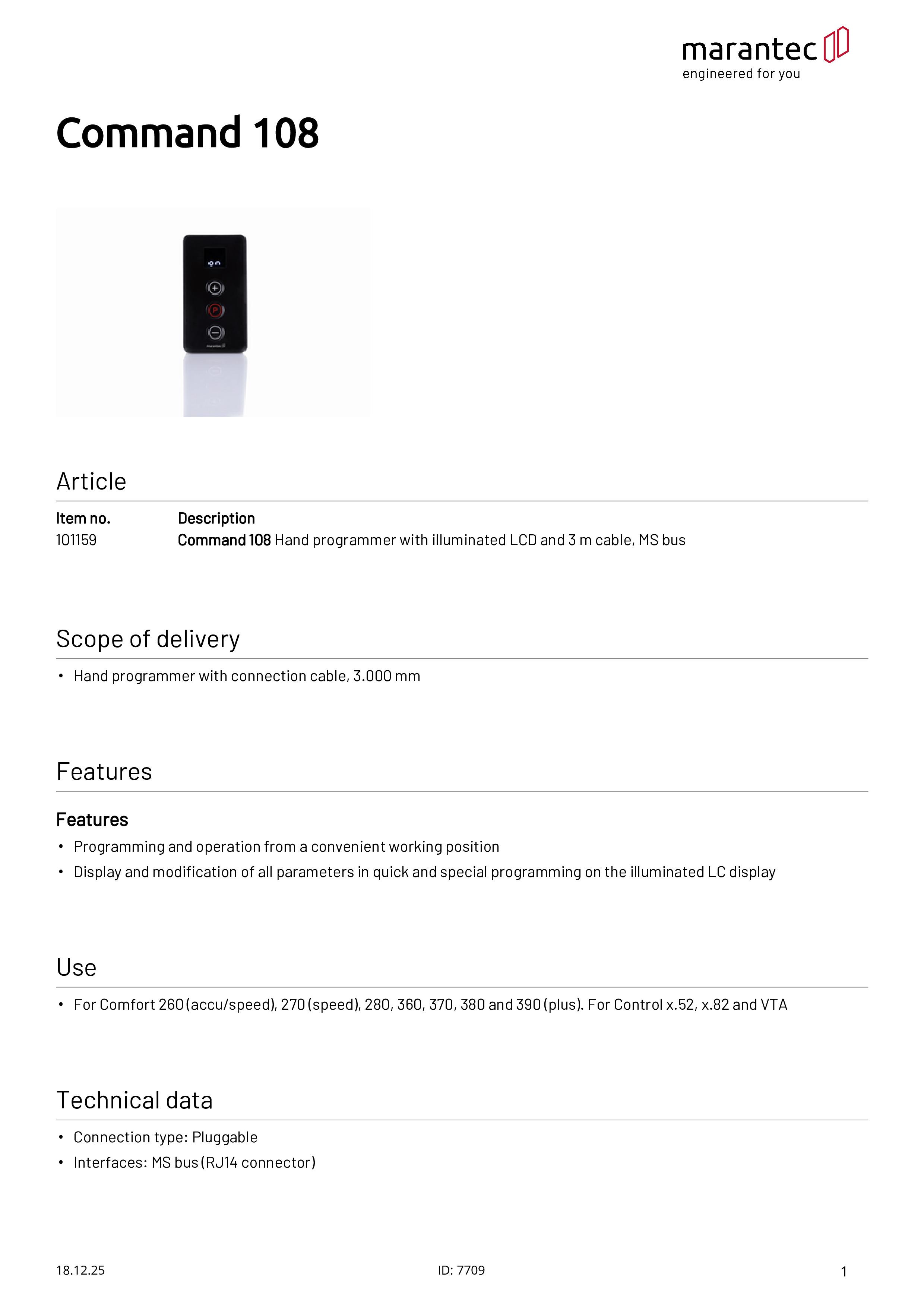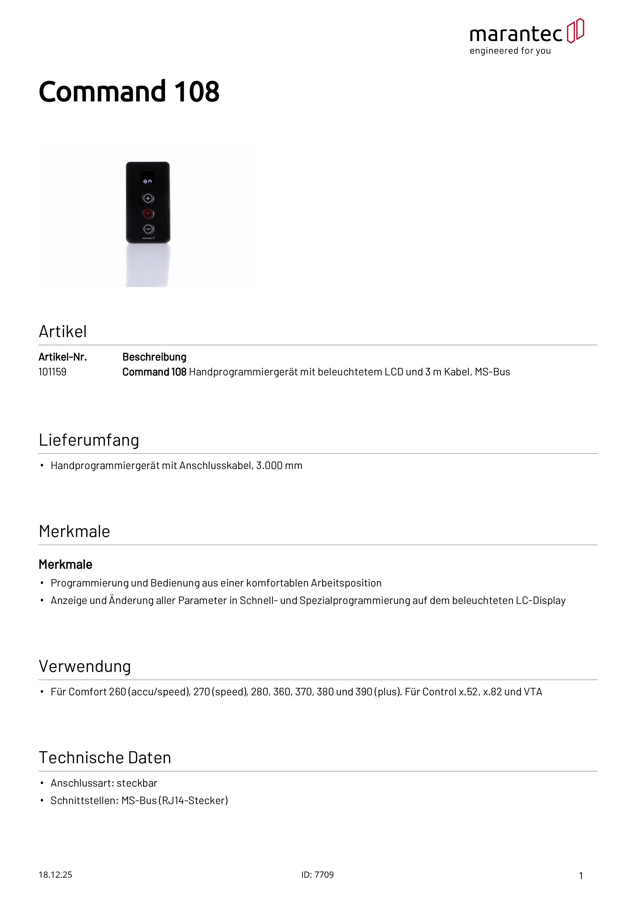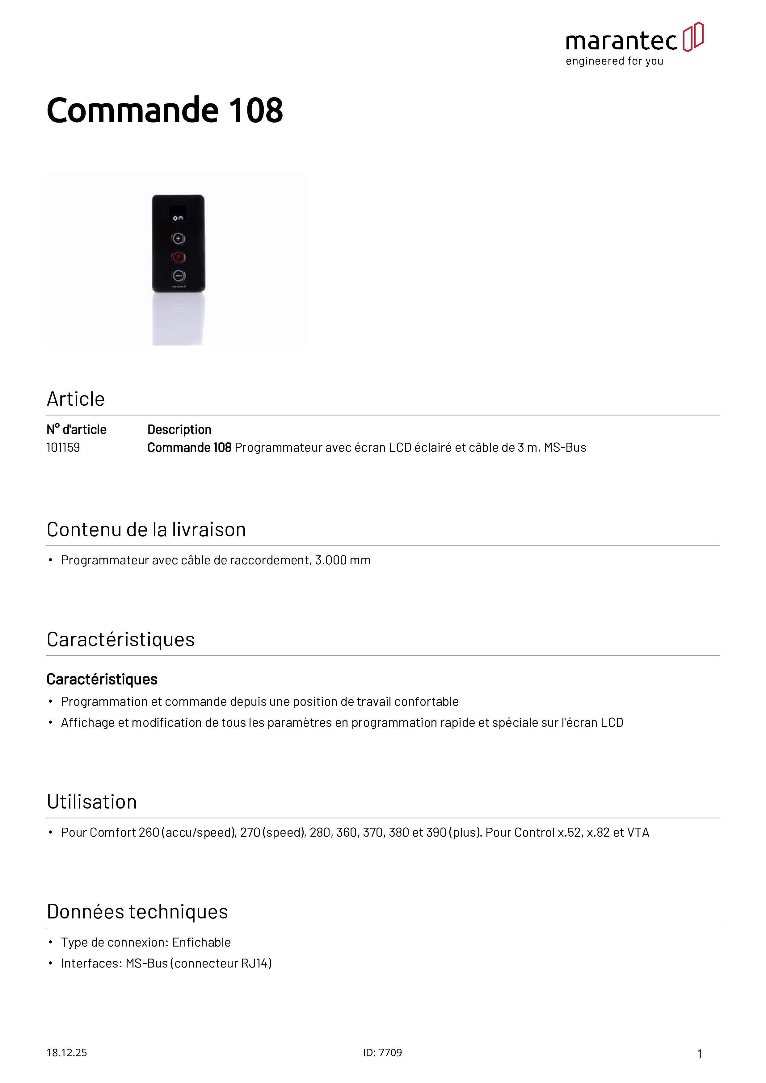 Programmateur Command 108 avec écran LCD éclairé et câble de 3 m, MS-Bus
