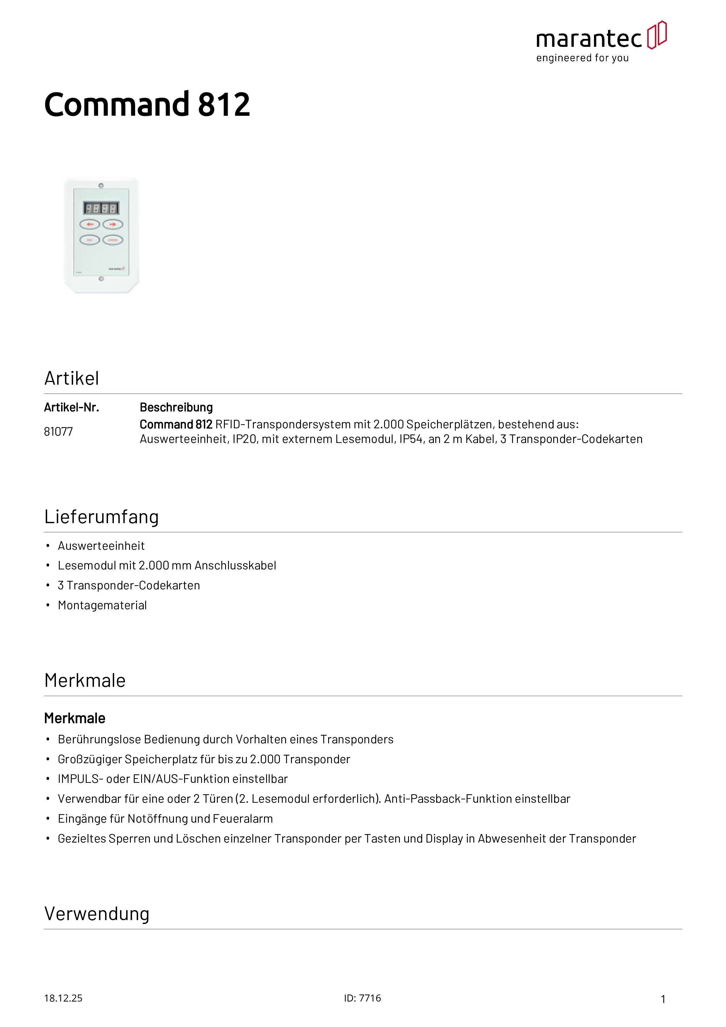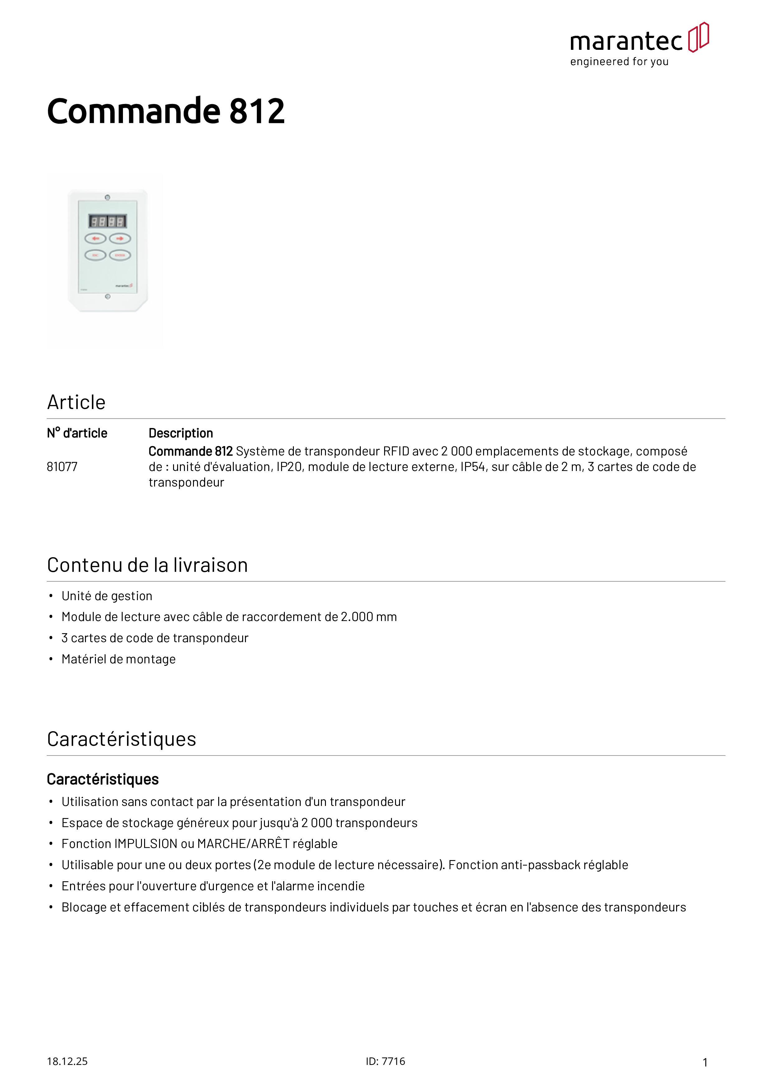 Command 812 Système de transpondeur RFID pour jusqu'à 2.000 utilisateurs