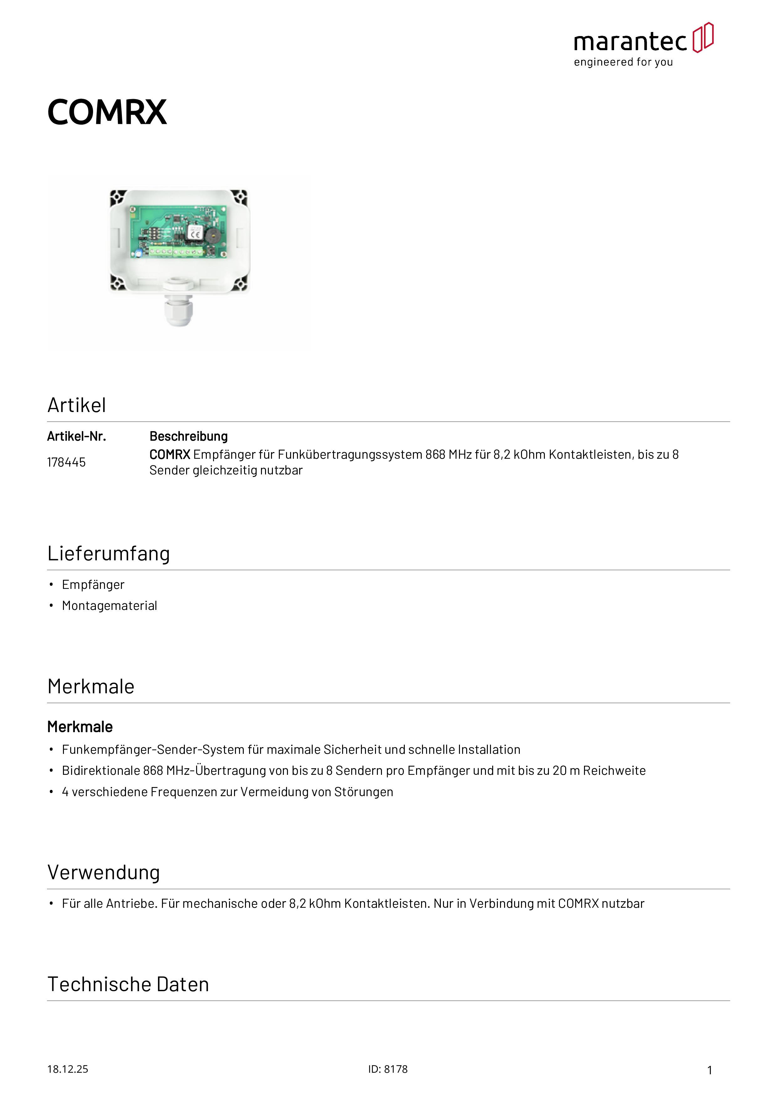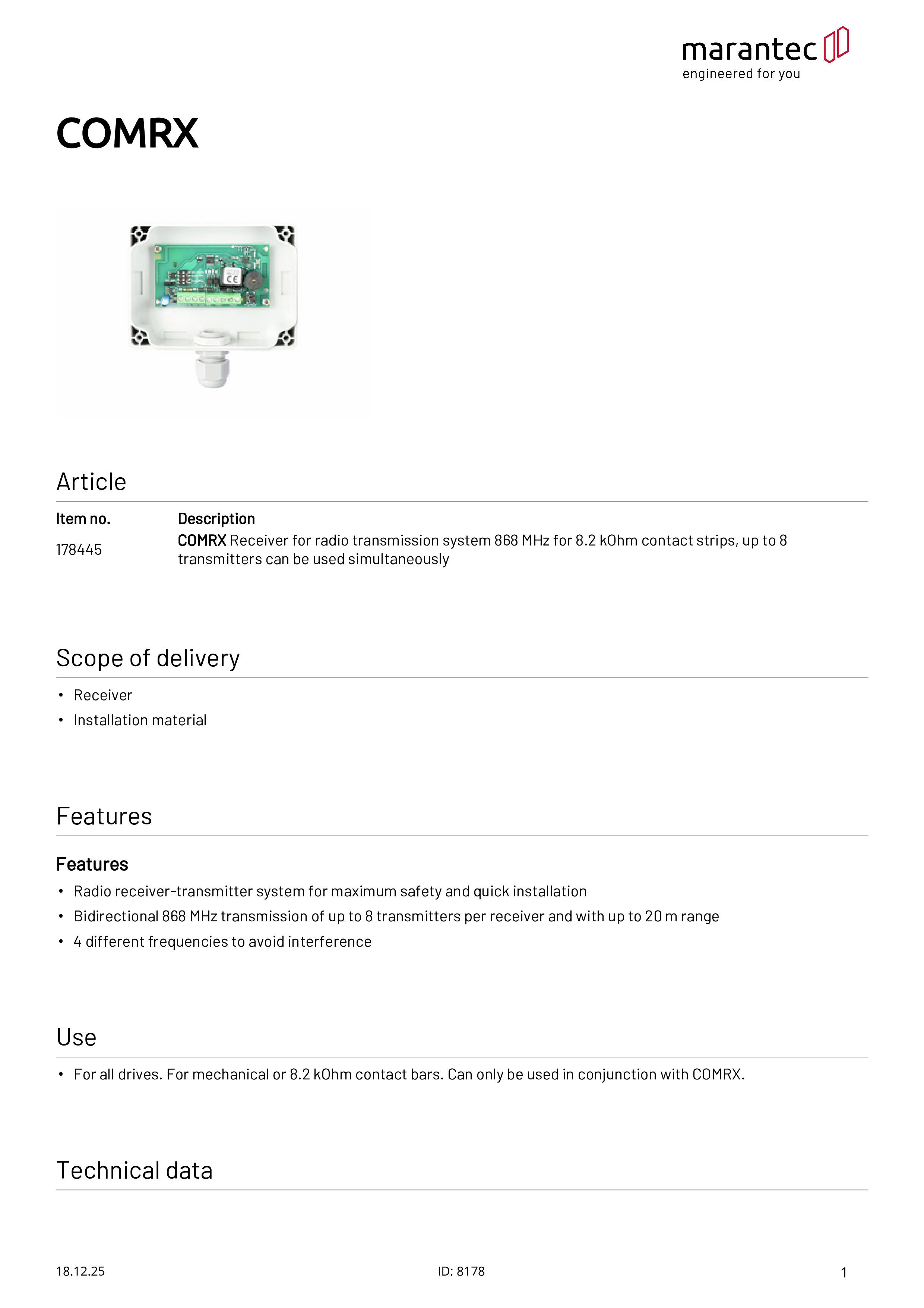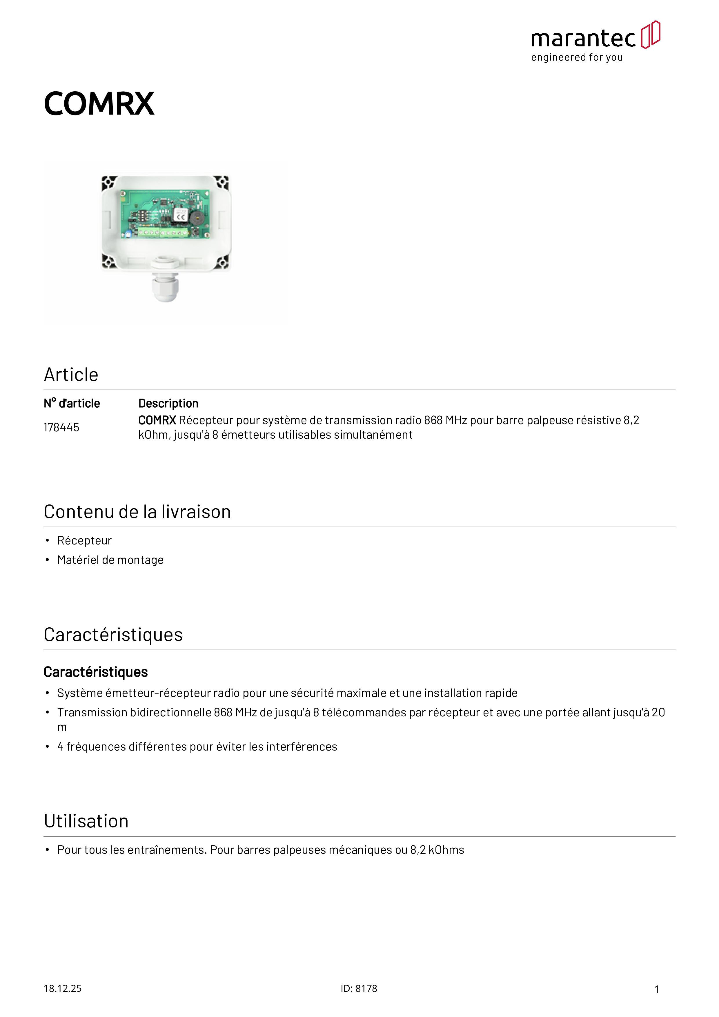 Récepteur COMRX pour transmission radio 868 MHz pour barre palpeuse 8,2 kOhms