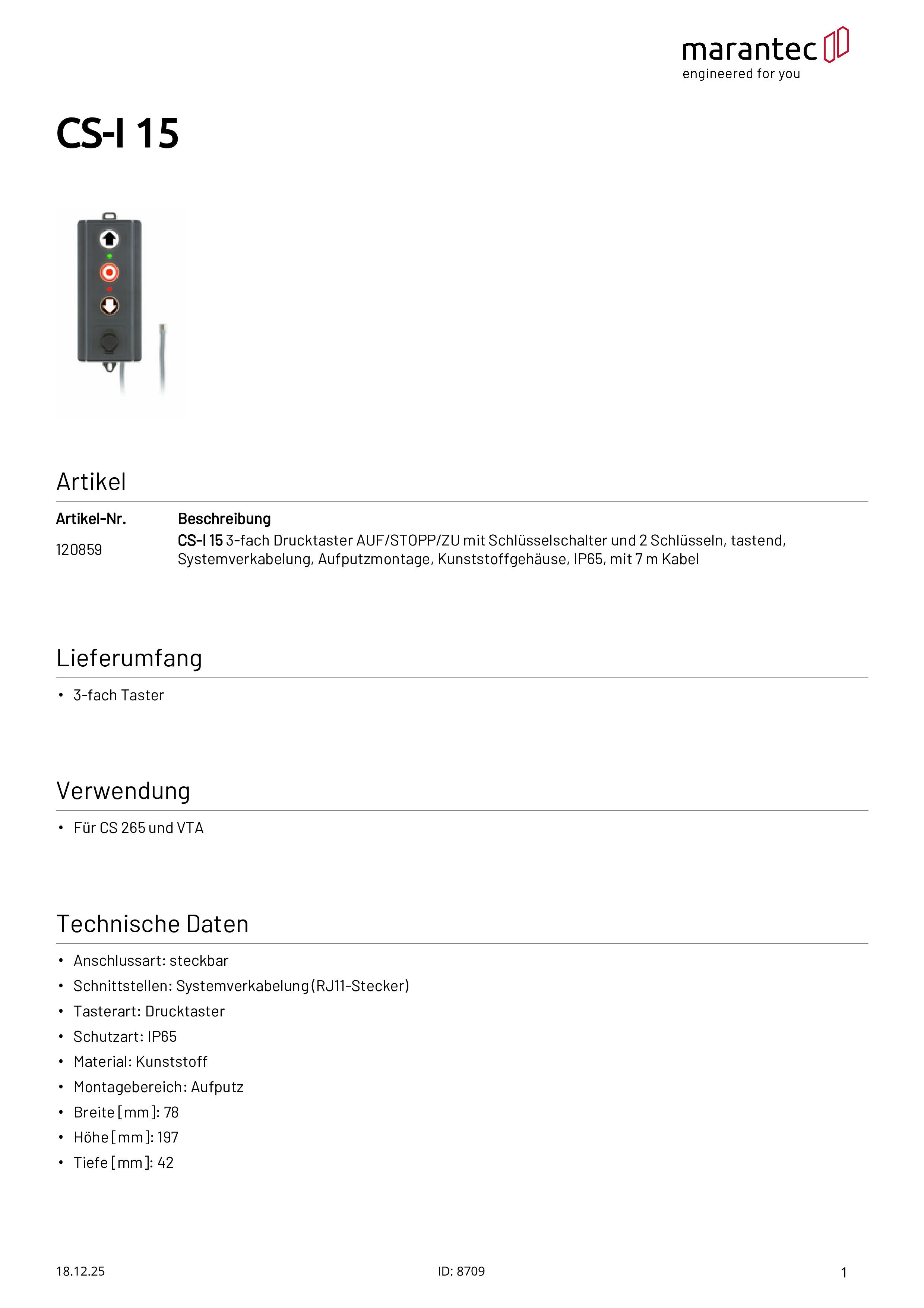 CS-I 15 Bouton-poussoir triple OUVERTURE/STOP/FERMETURE avec interrupteur à clé pour montage apparent