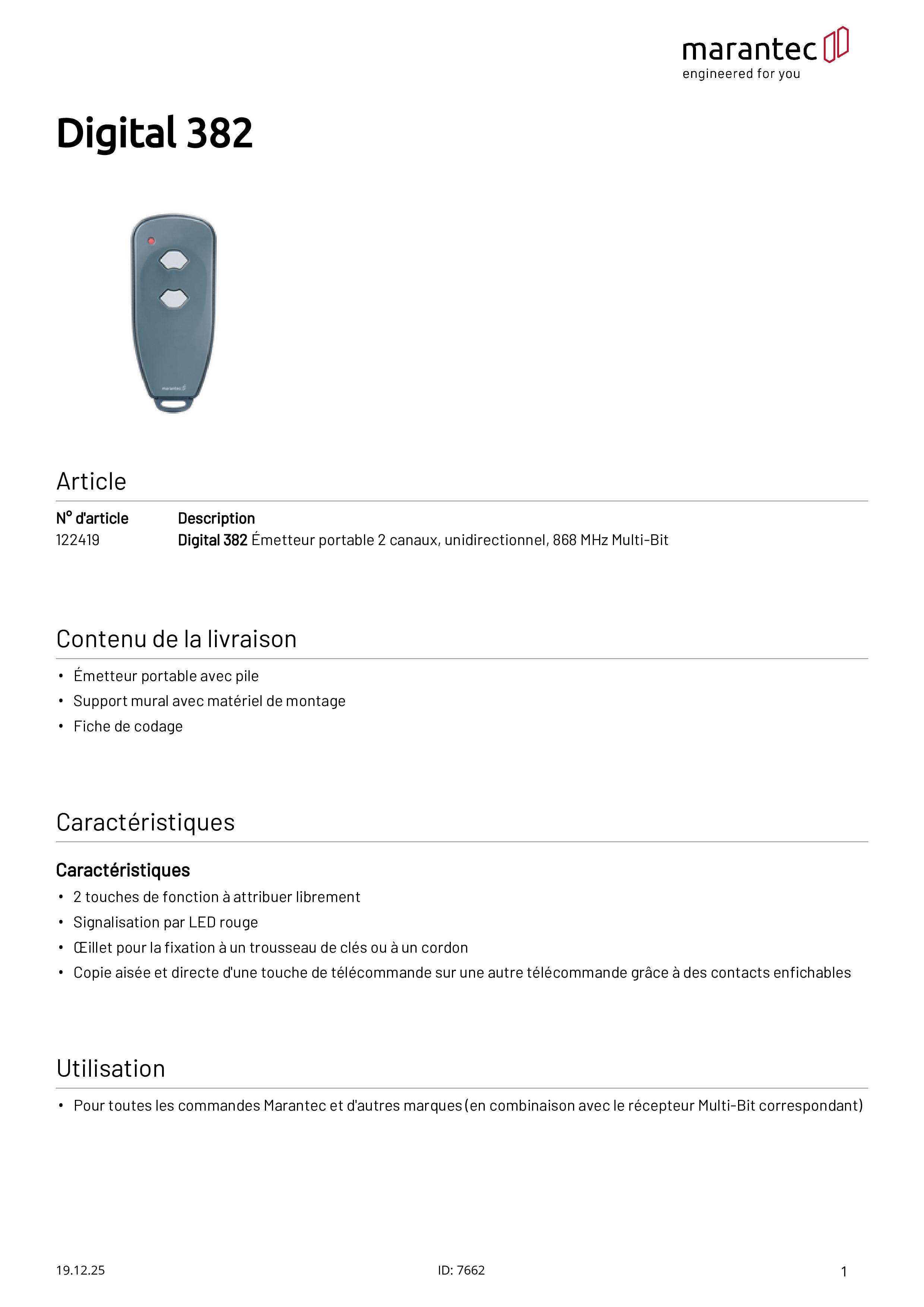 Digital 382 Télécommande 2 canaux 868 MHz multi-bit
