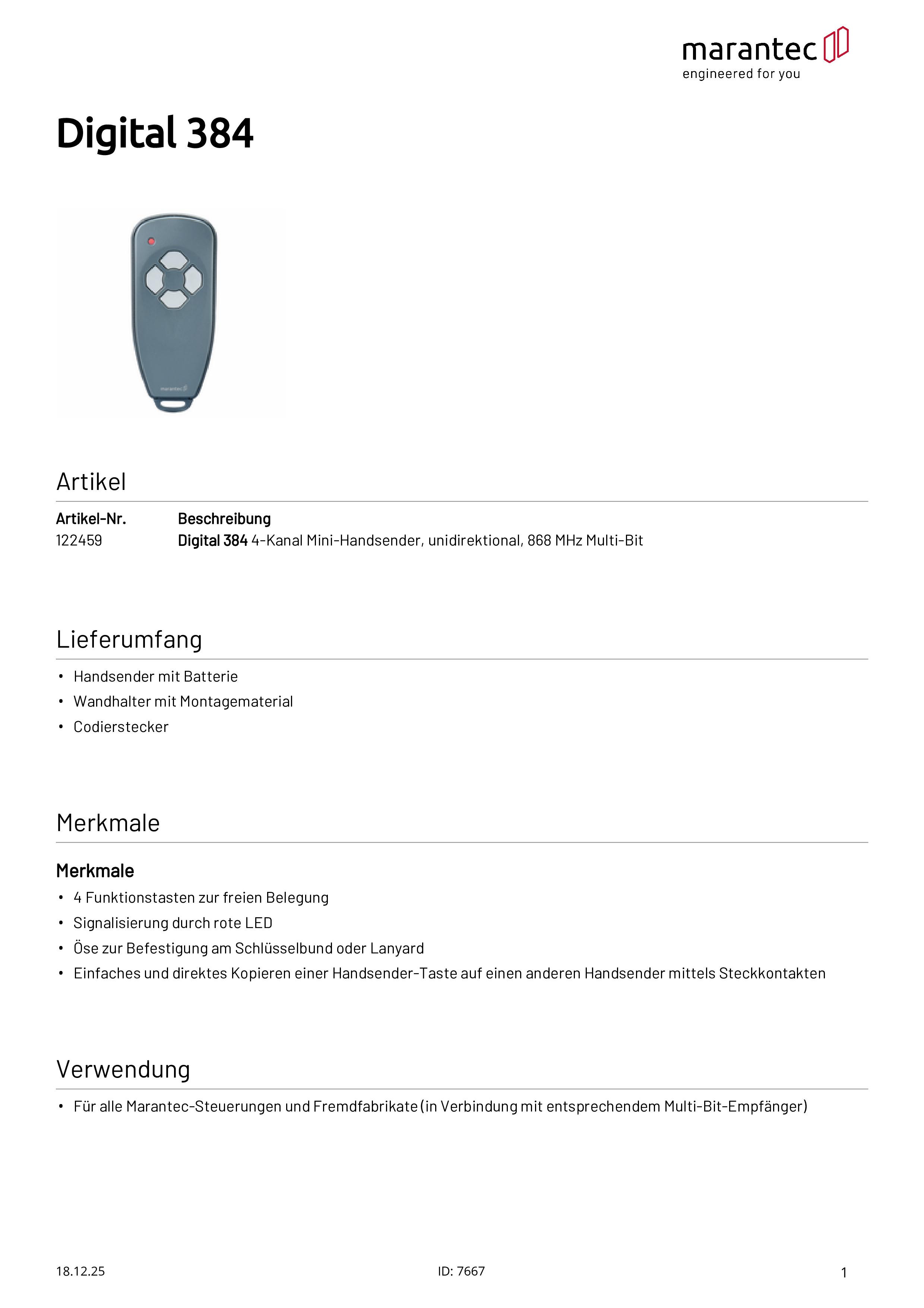 Digital 384 Télécommande 4 canaux 868 MHz multi-bit