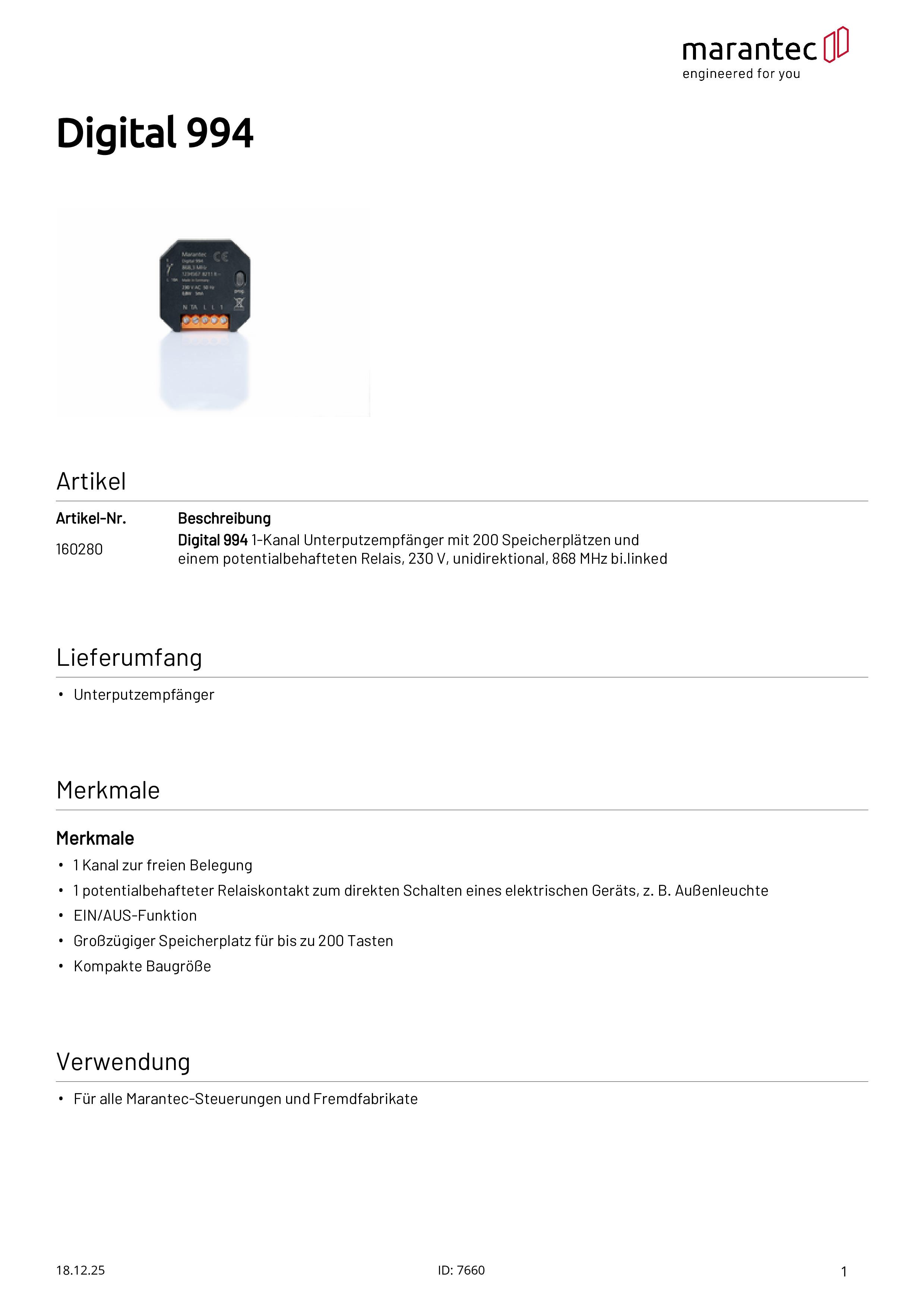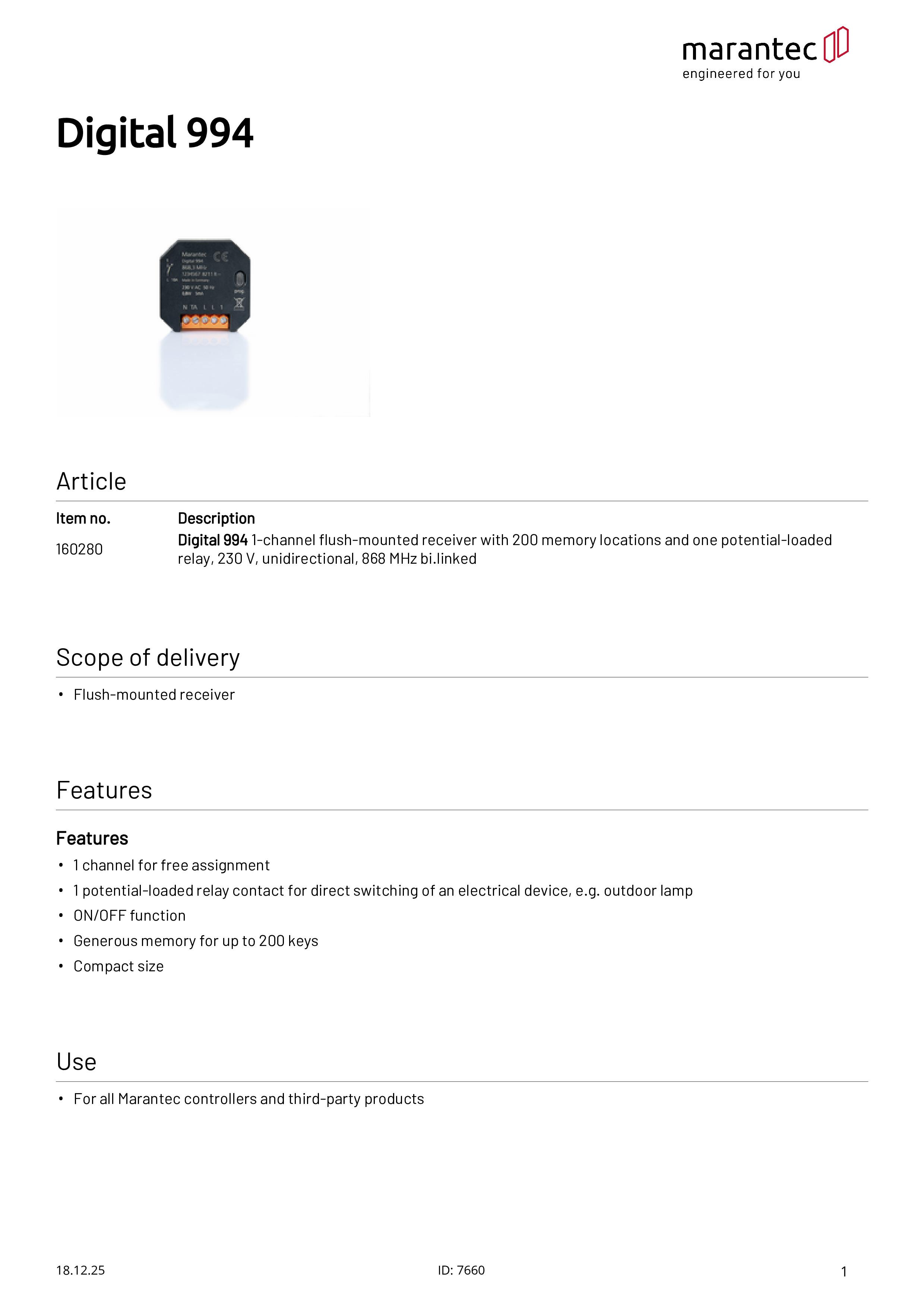 Digital 994 Récepteur encastré 1 canal 868 MHz bi.linked