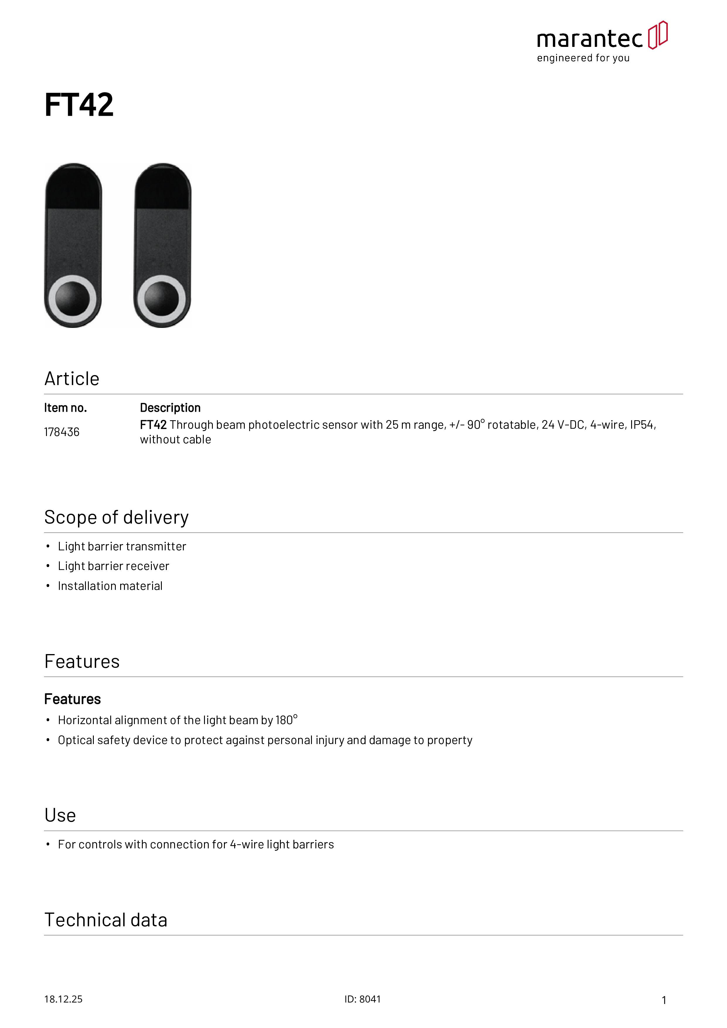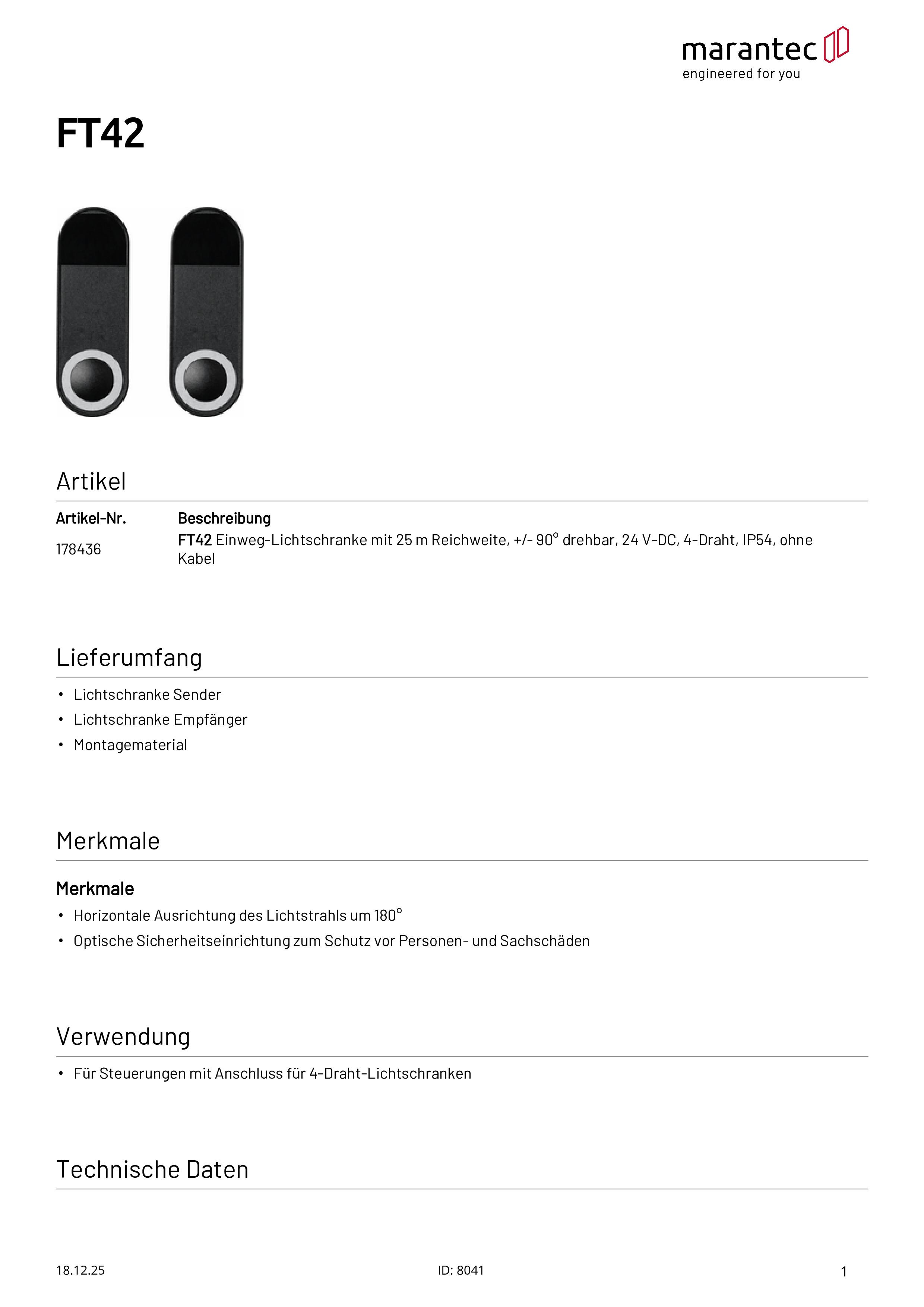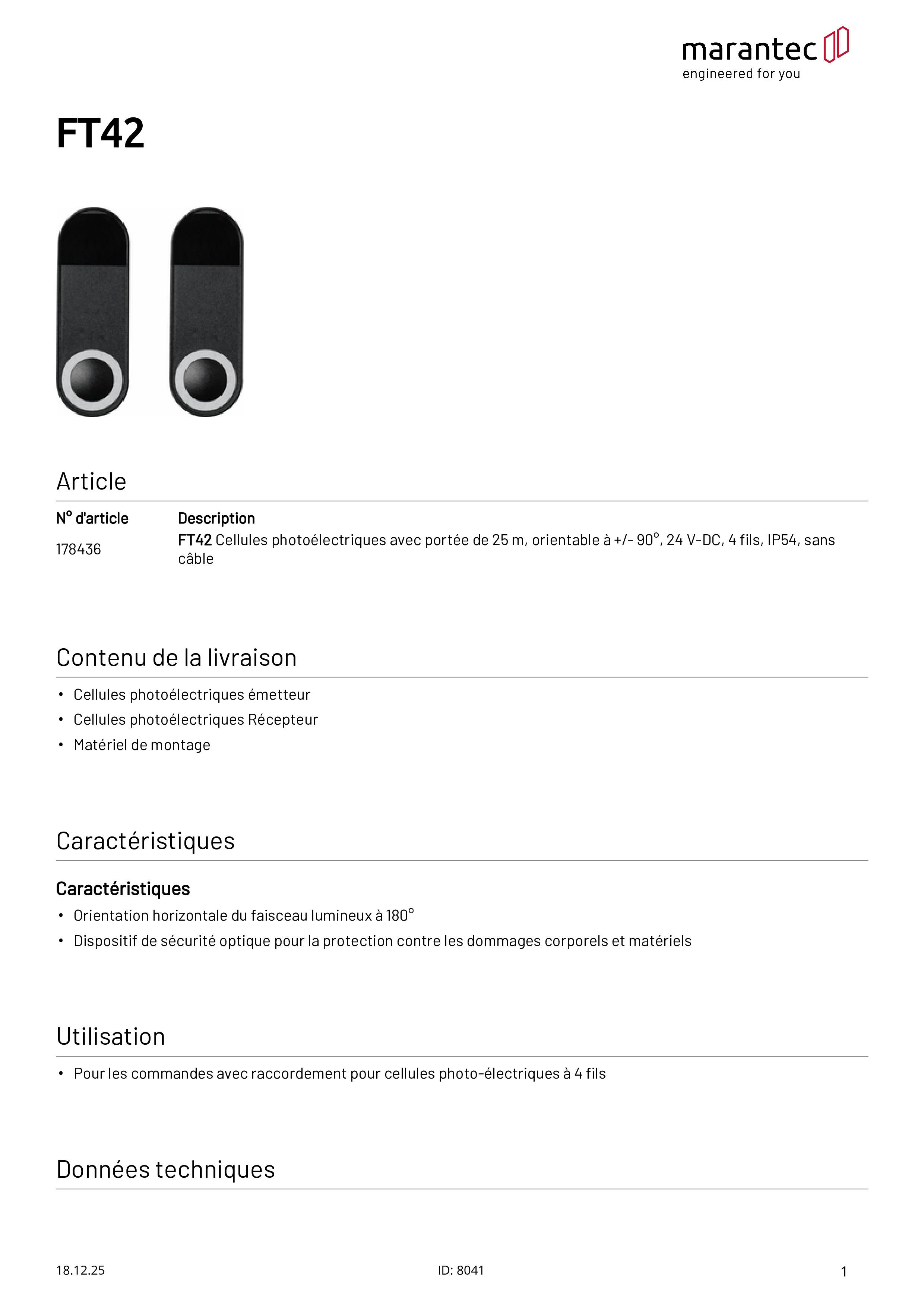 FT42 Cellule photoélectrique avec portée de 25 m, 4 fils, sans câble
