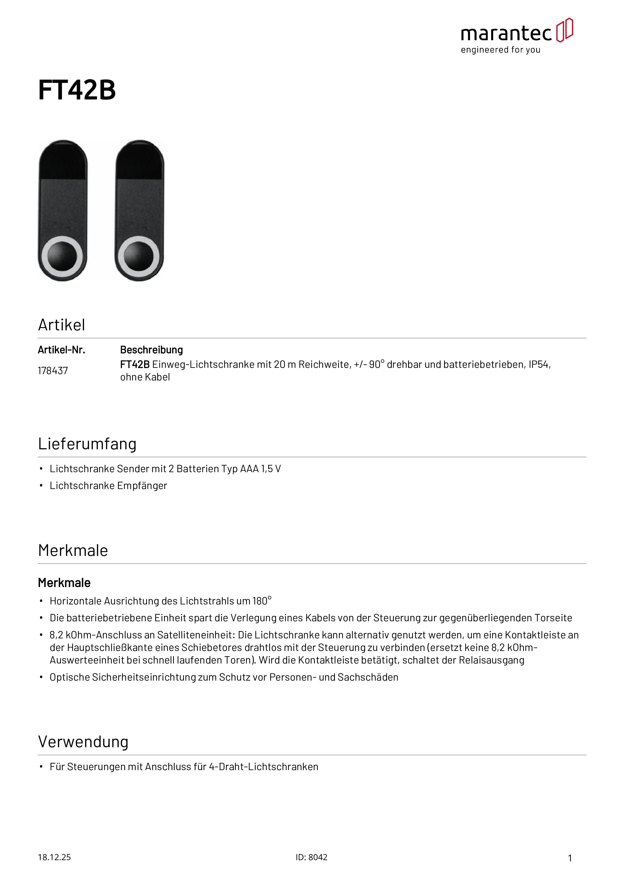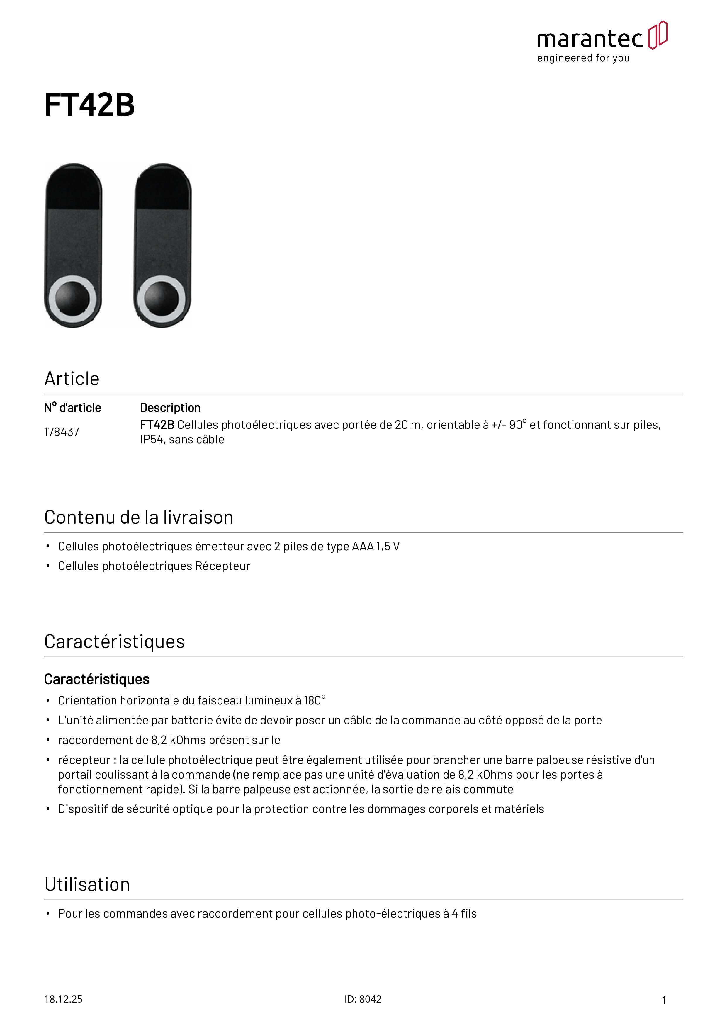 FT42B Cellule photoélectrique avec portée de 20 m, alimentée par pile