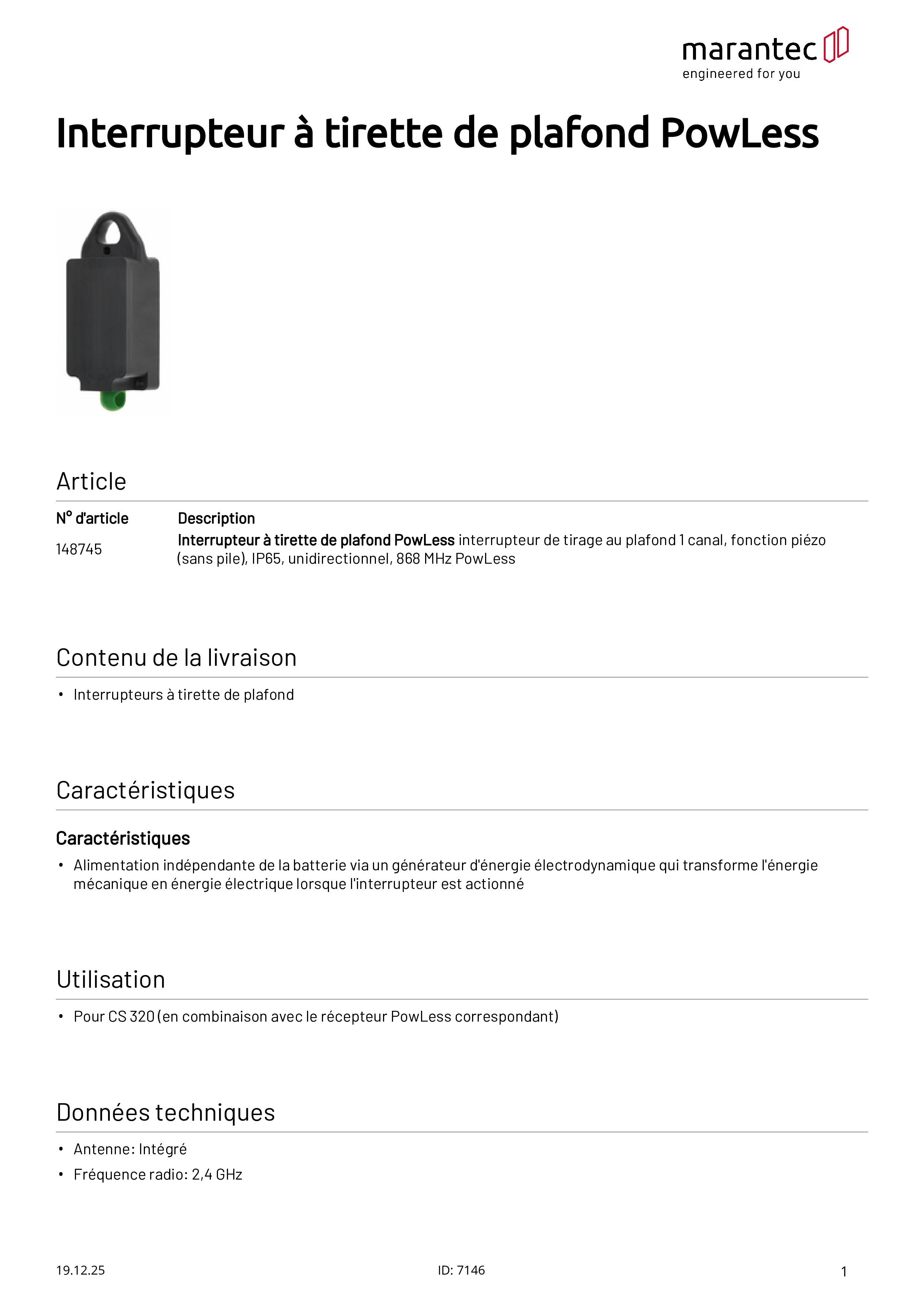 PowLess Interrupteur à tirette pour plafond, fonction piézo (sans pile), IP65, 868 MHz PowLess