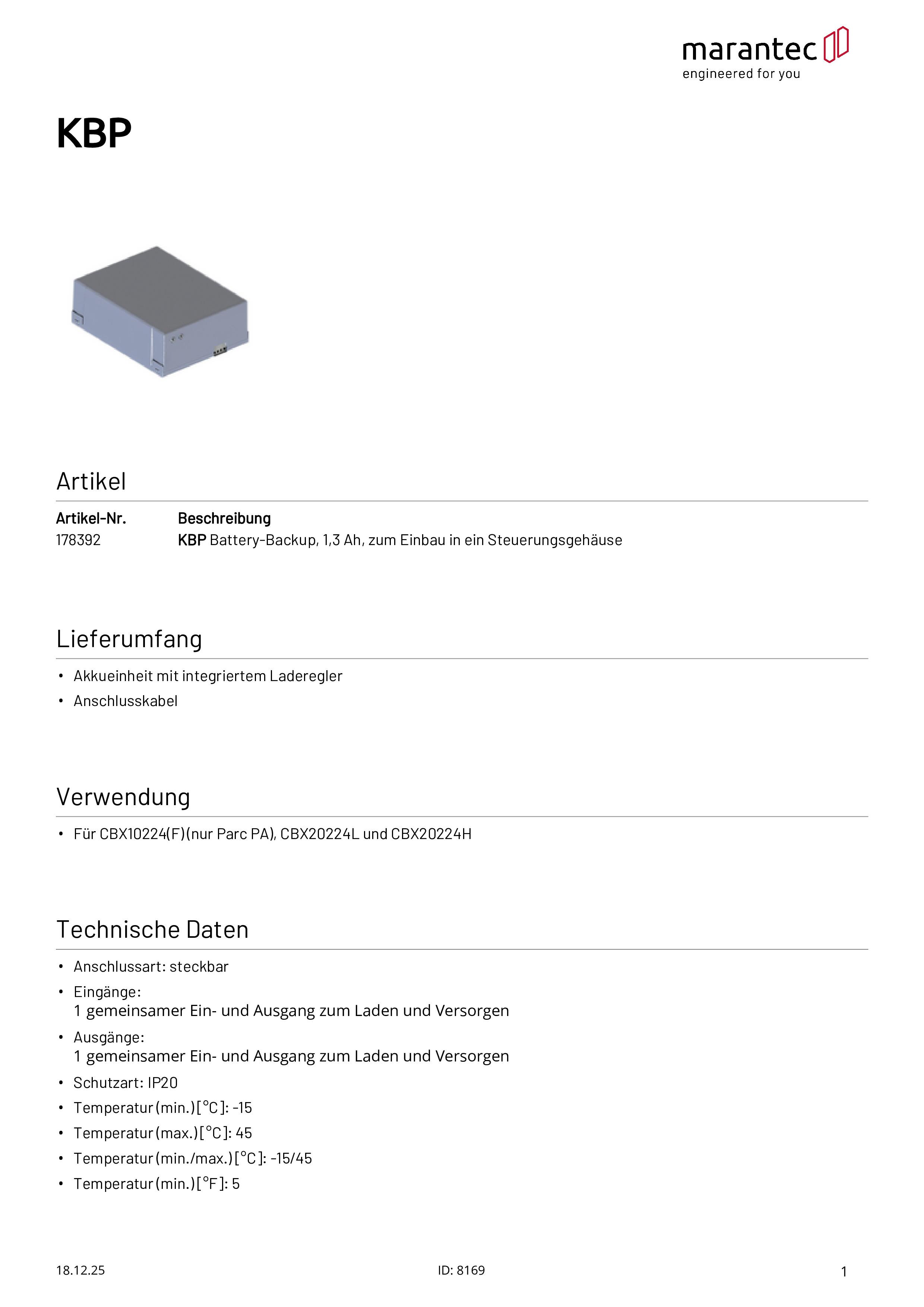 KBP Battery-Backup, 1,3 Ah, à monter dans le boîtier de commande CBX
