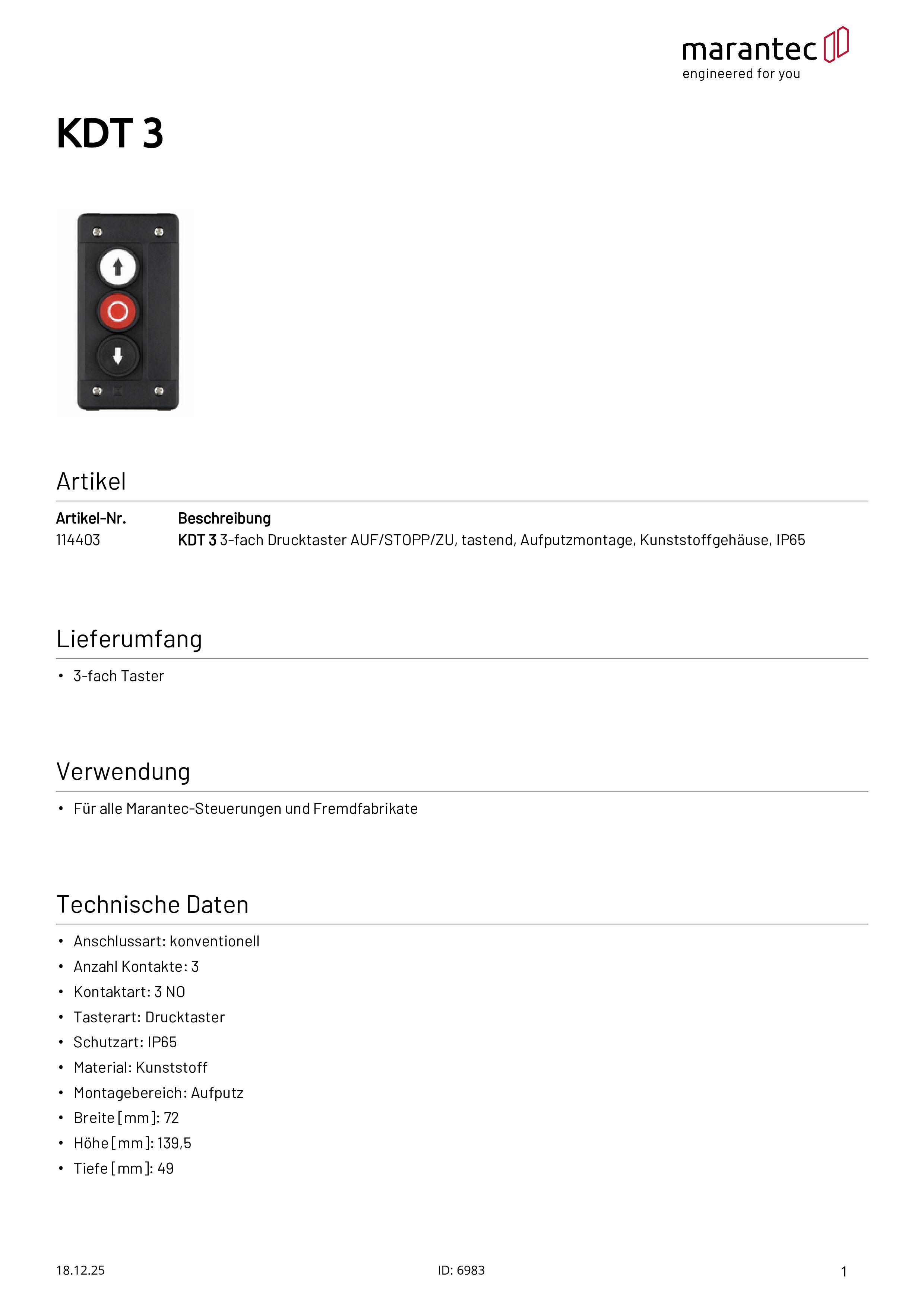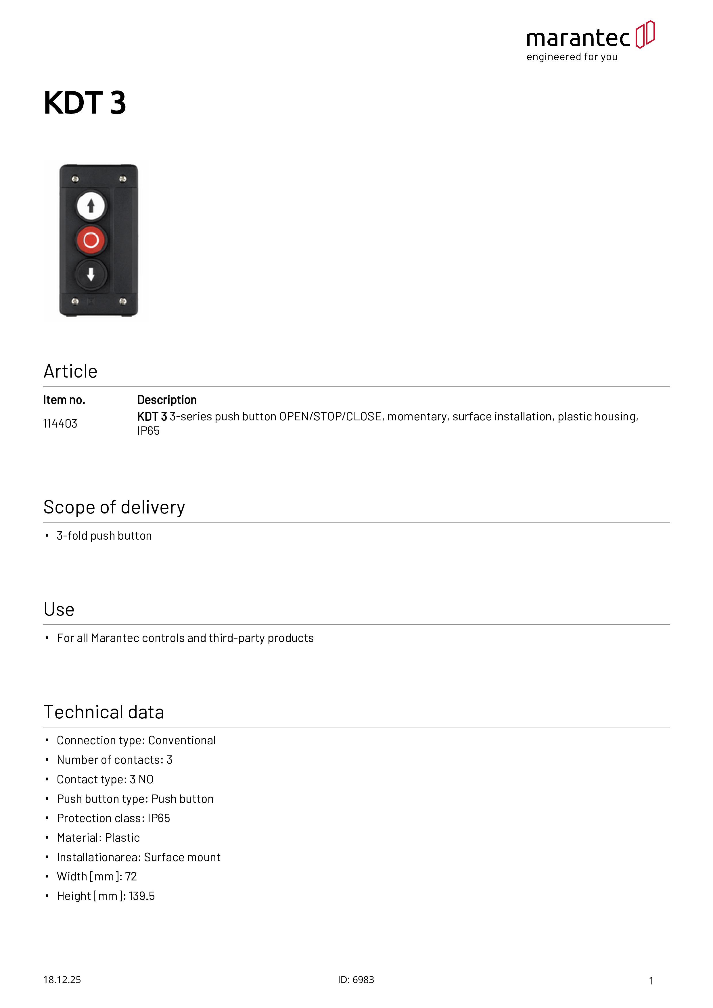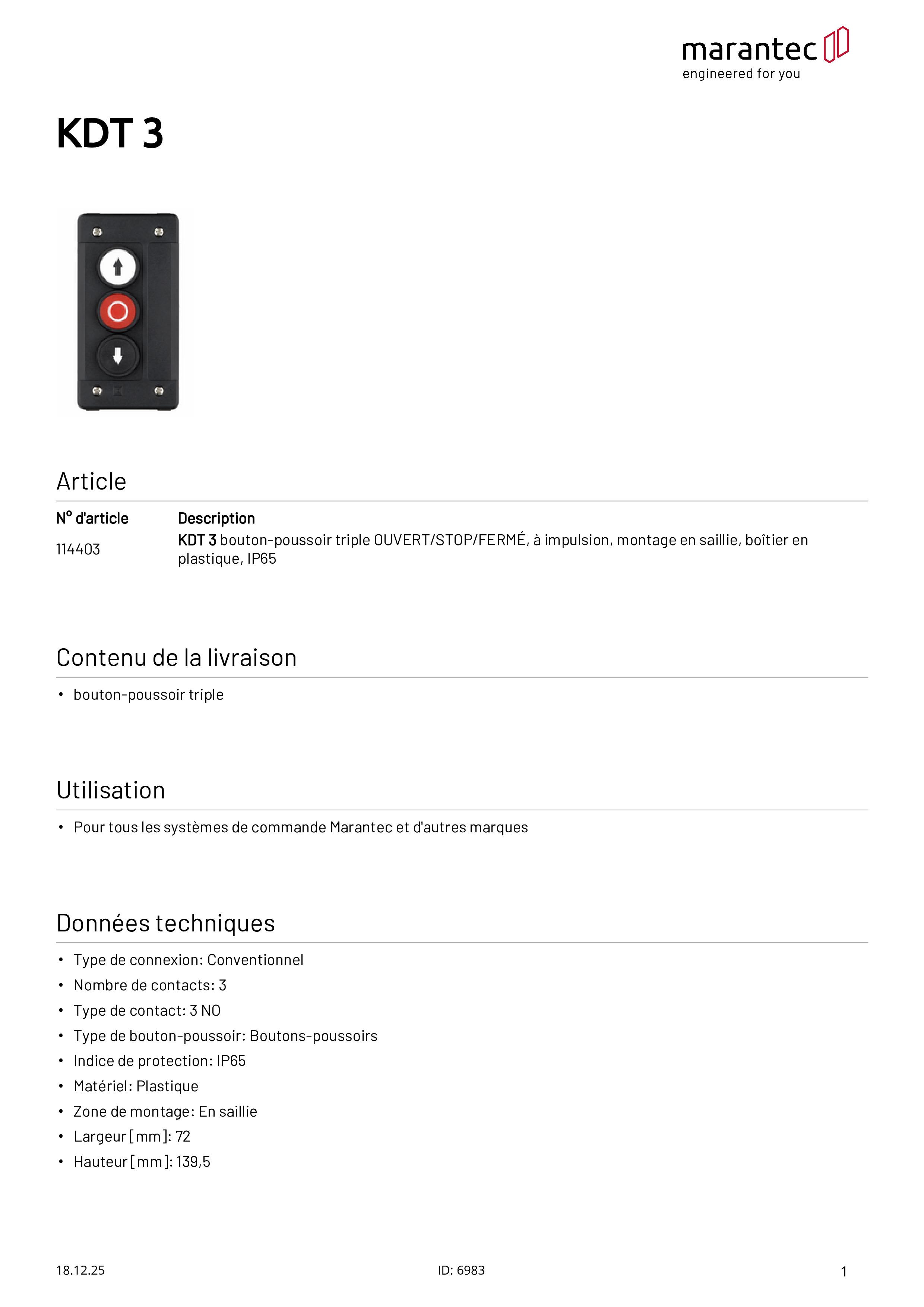 KDT 3 Bouton-poussoir triple OUVERTURE/STOP/FERMETURE en saillie Boîtier plastique IP65
