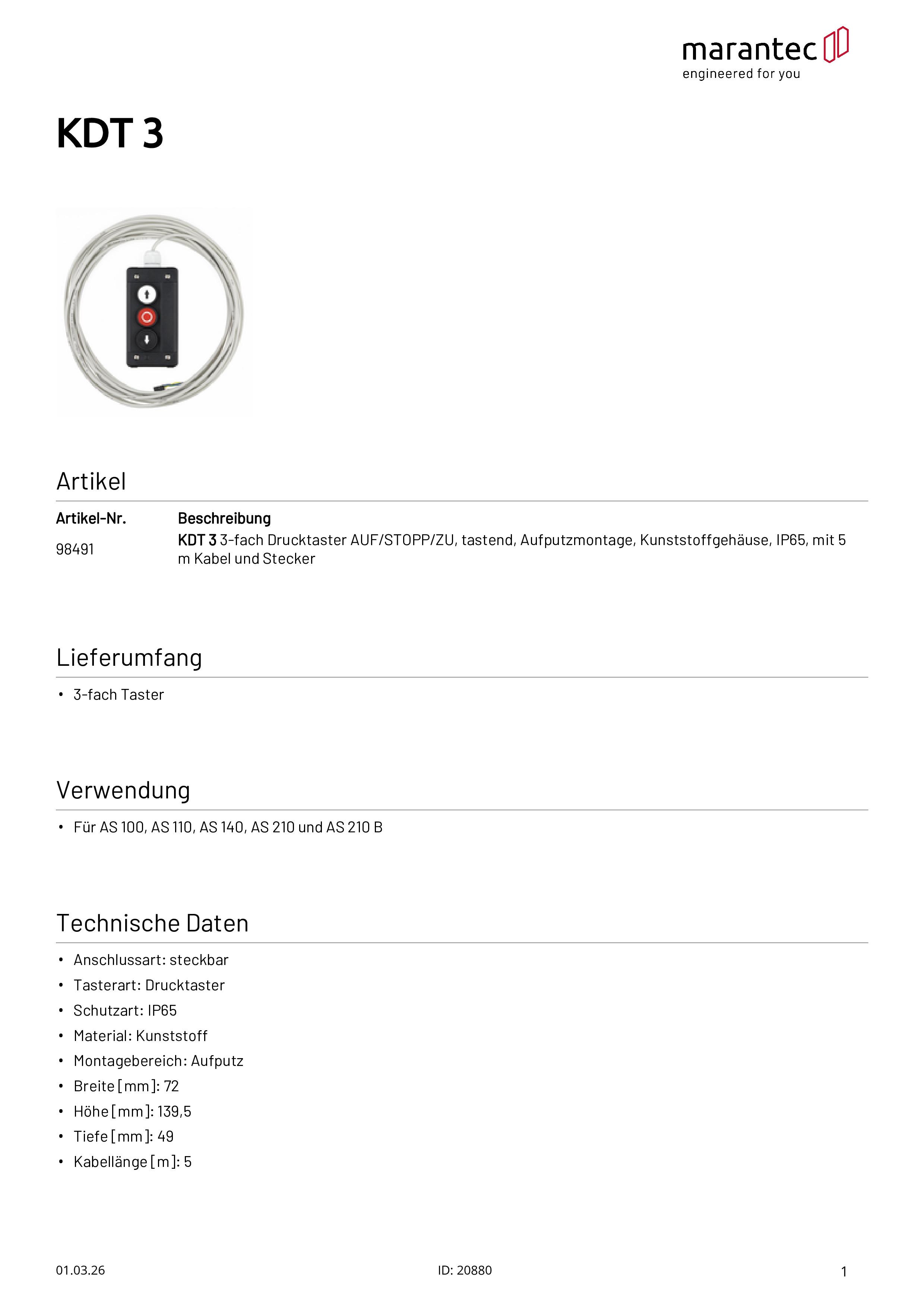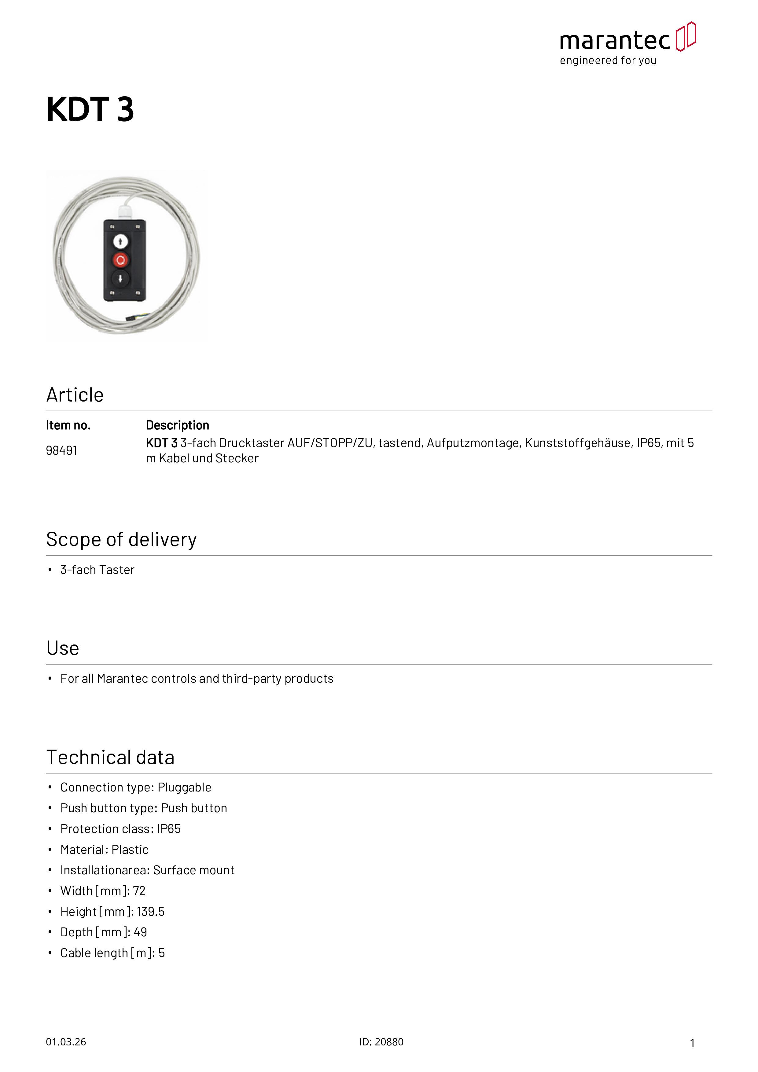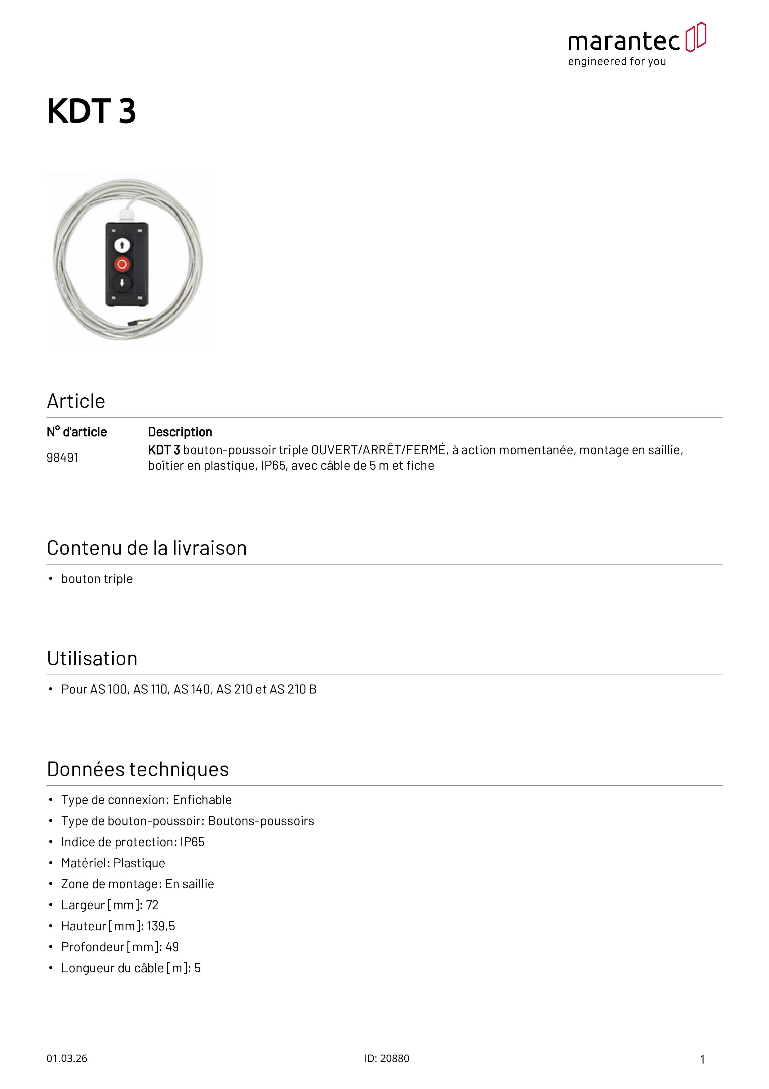 KDT 3 Bouton-poussoir triple OUVERT/ARRÊT/FERMÉ Boîtier en plastique apparent IP65 avec câble de 5 m et fiche pour commandes AS