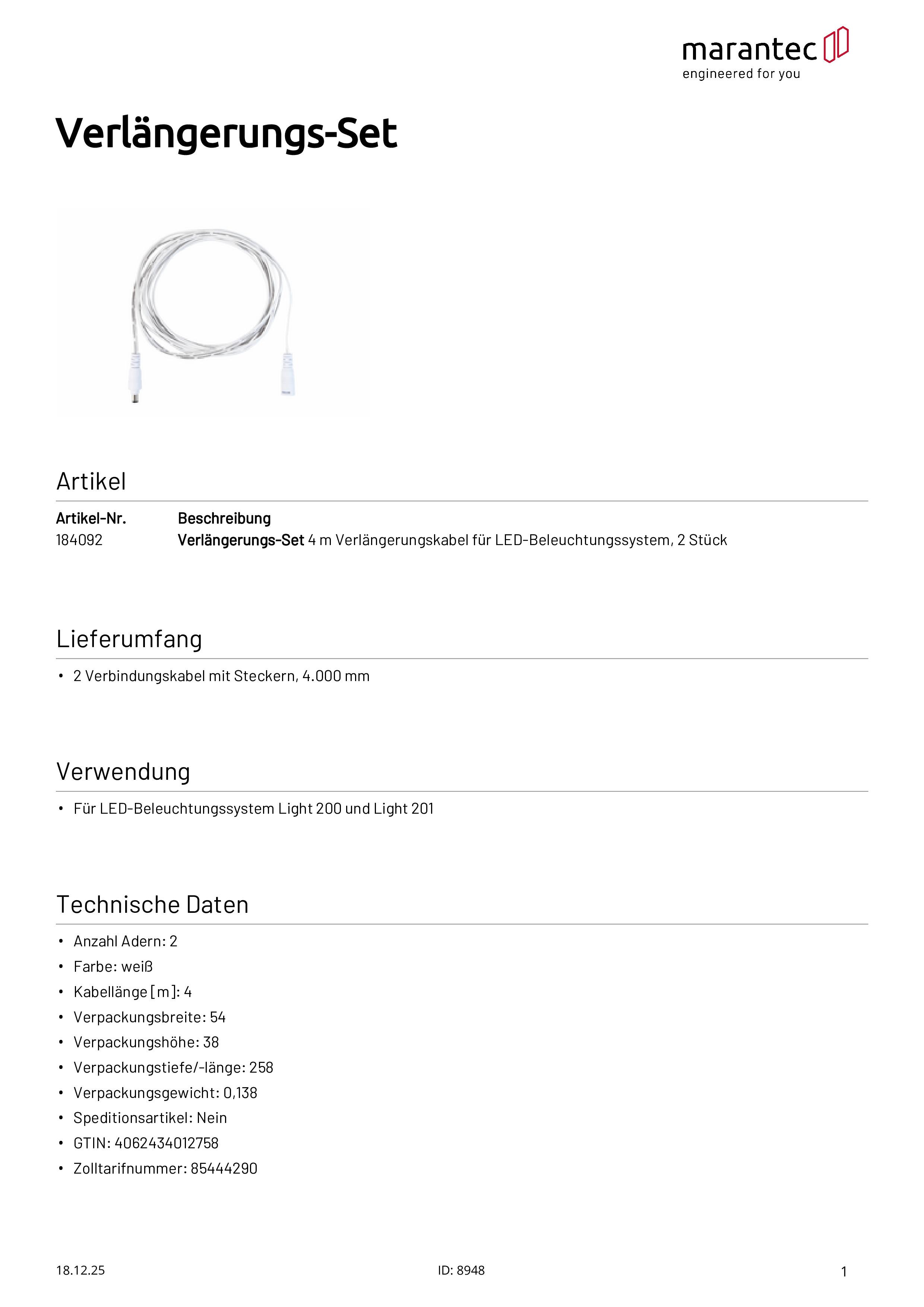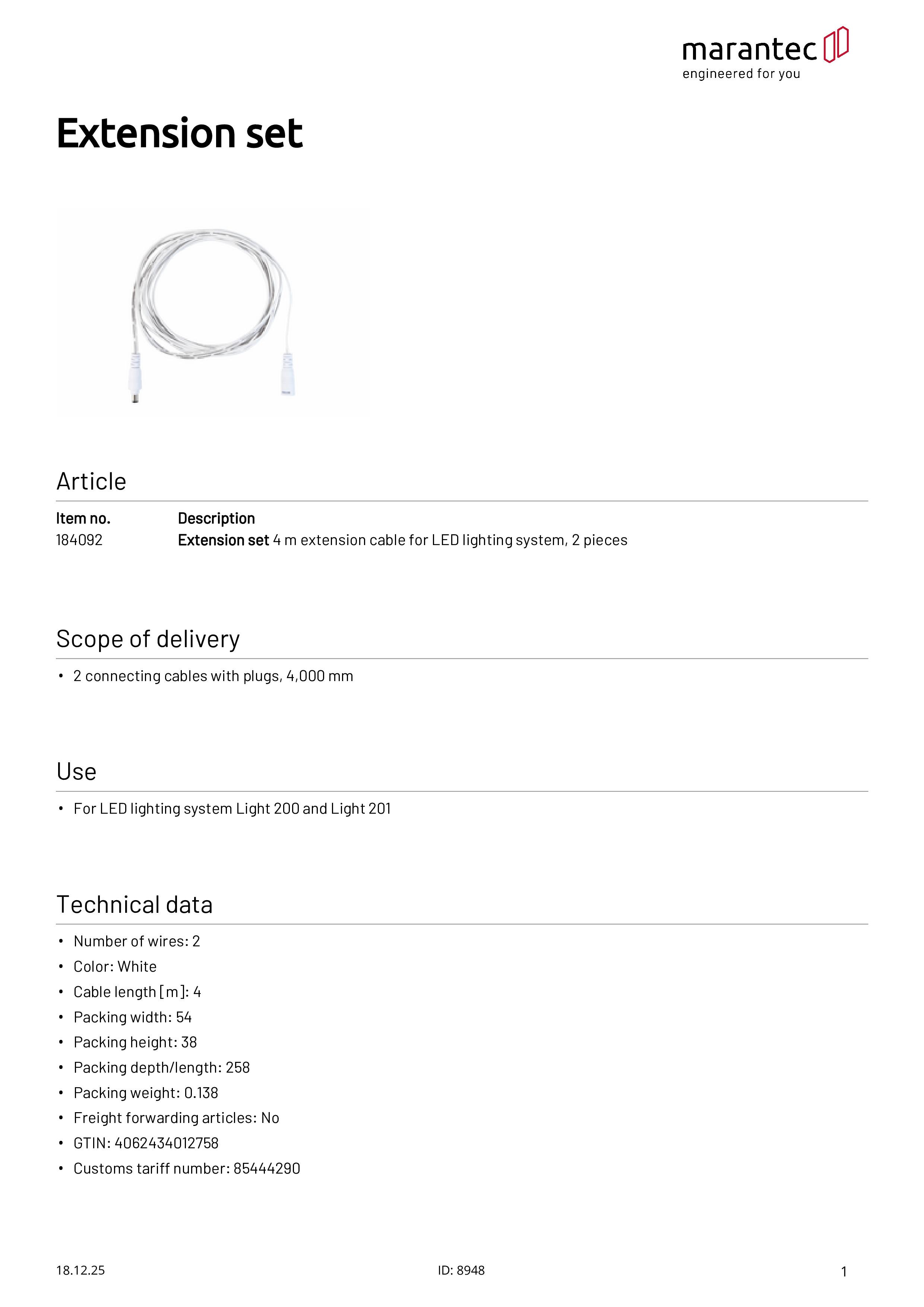 Rallonge avec 4 m de câble pour Light 200/201, set de 2 pièces