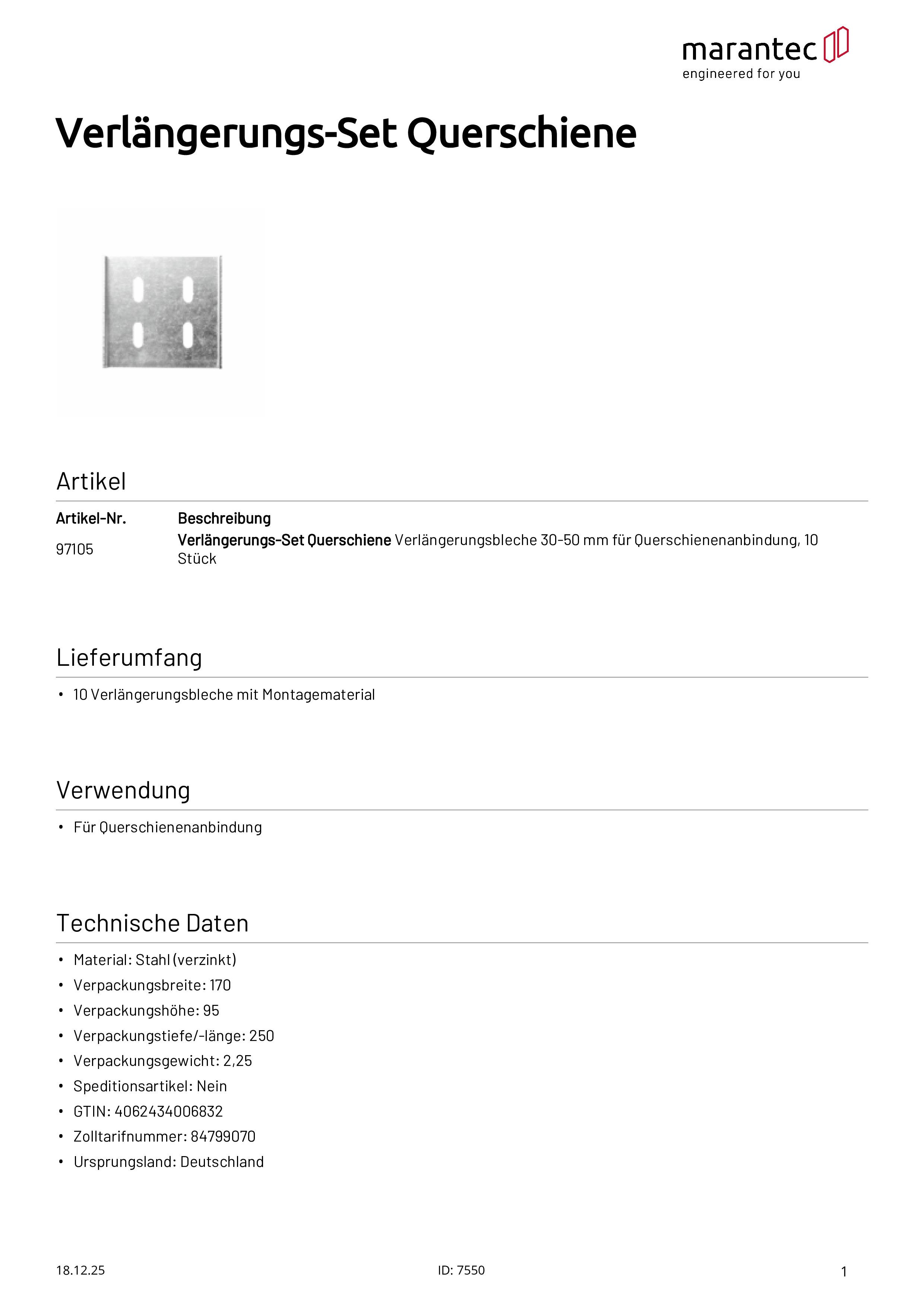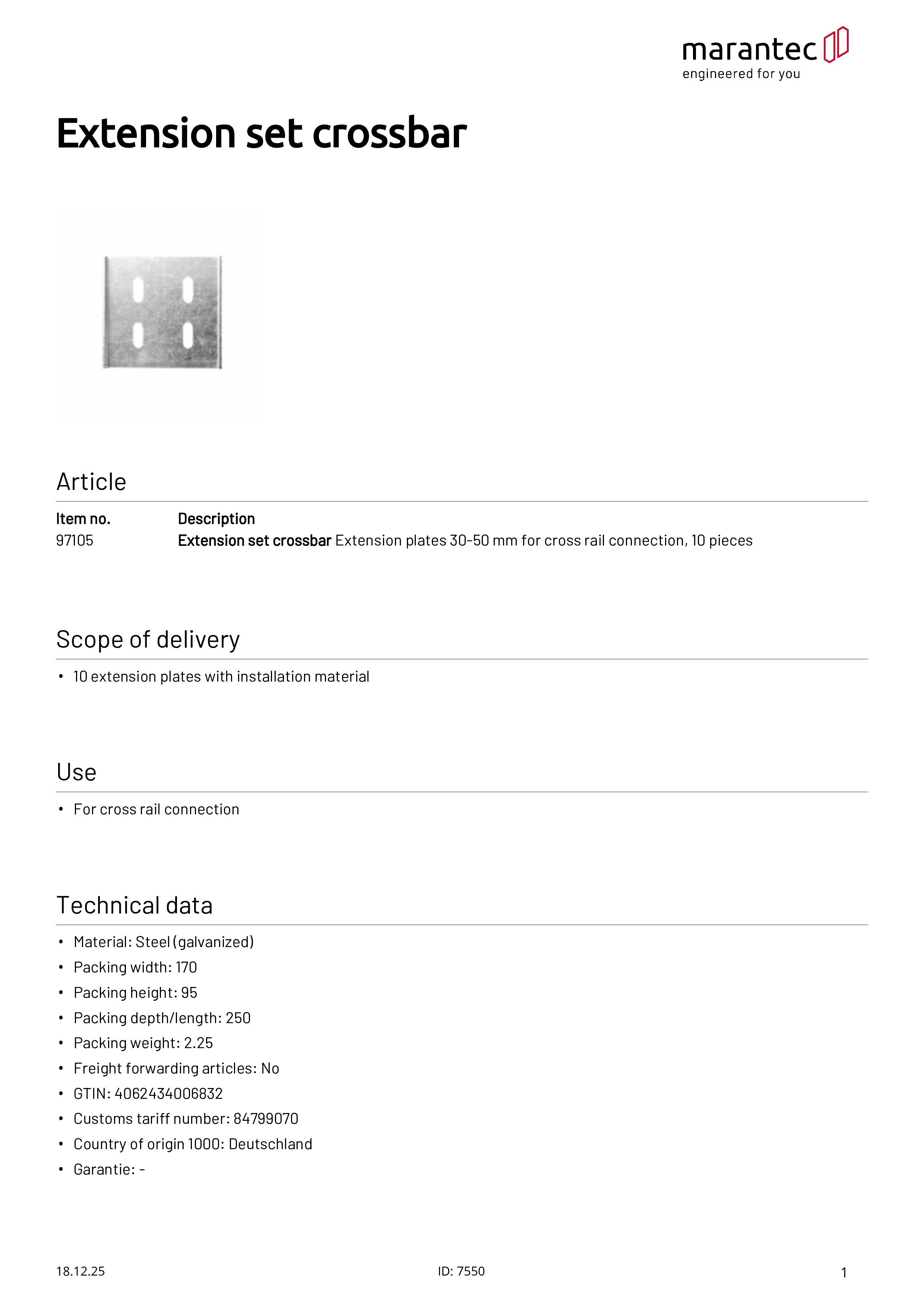 Rallonge 30-50 mm pour connexion de rail transversal, kit de 10 pièces