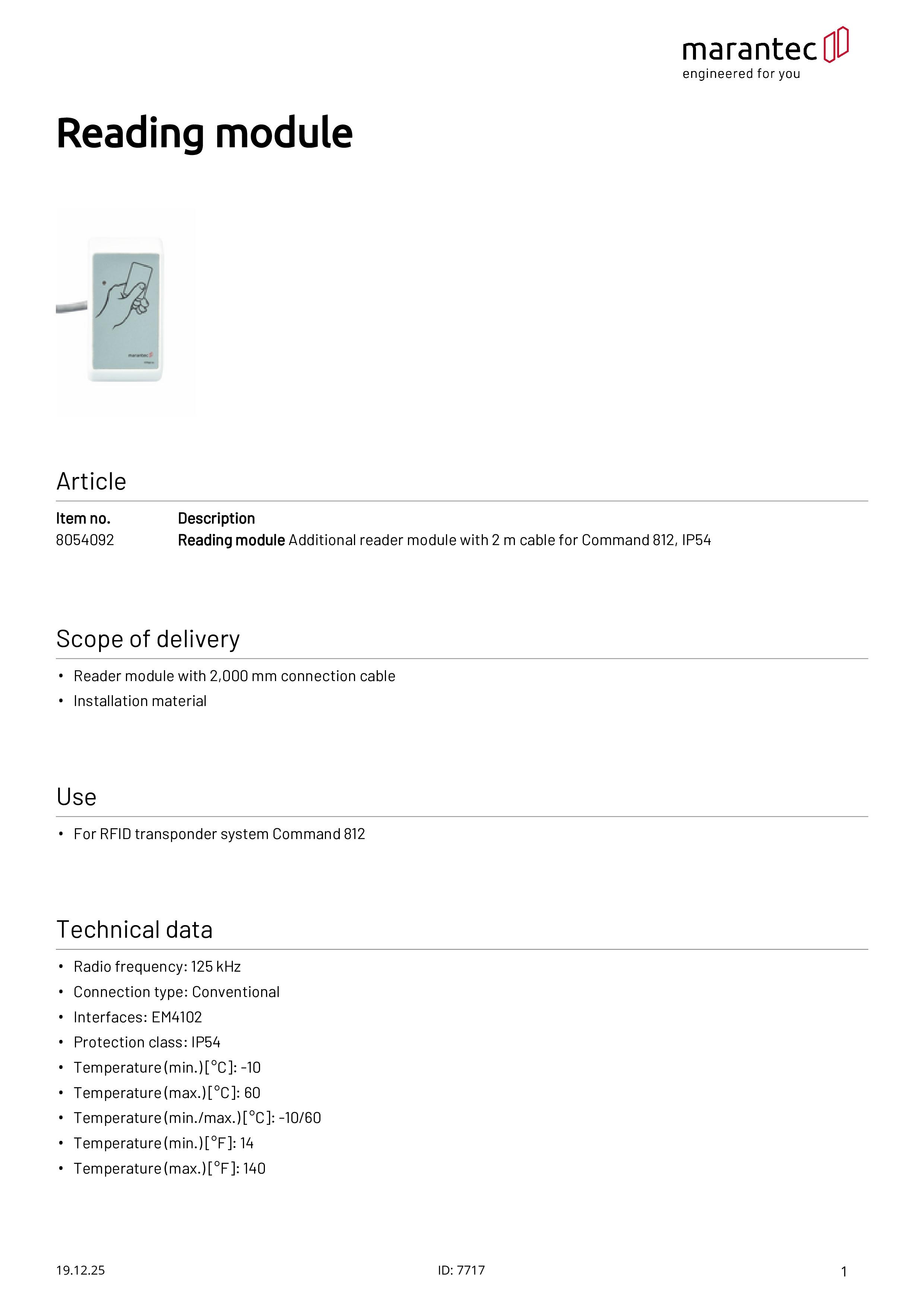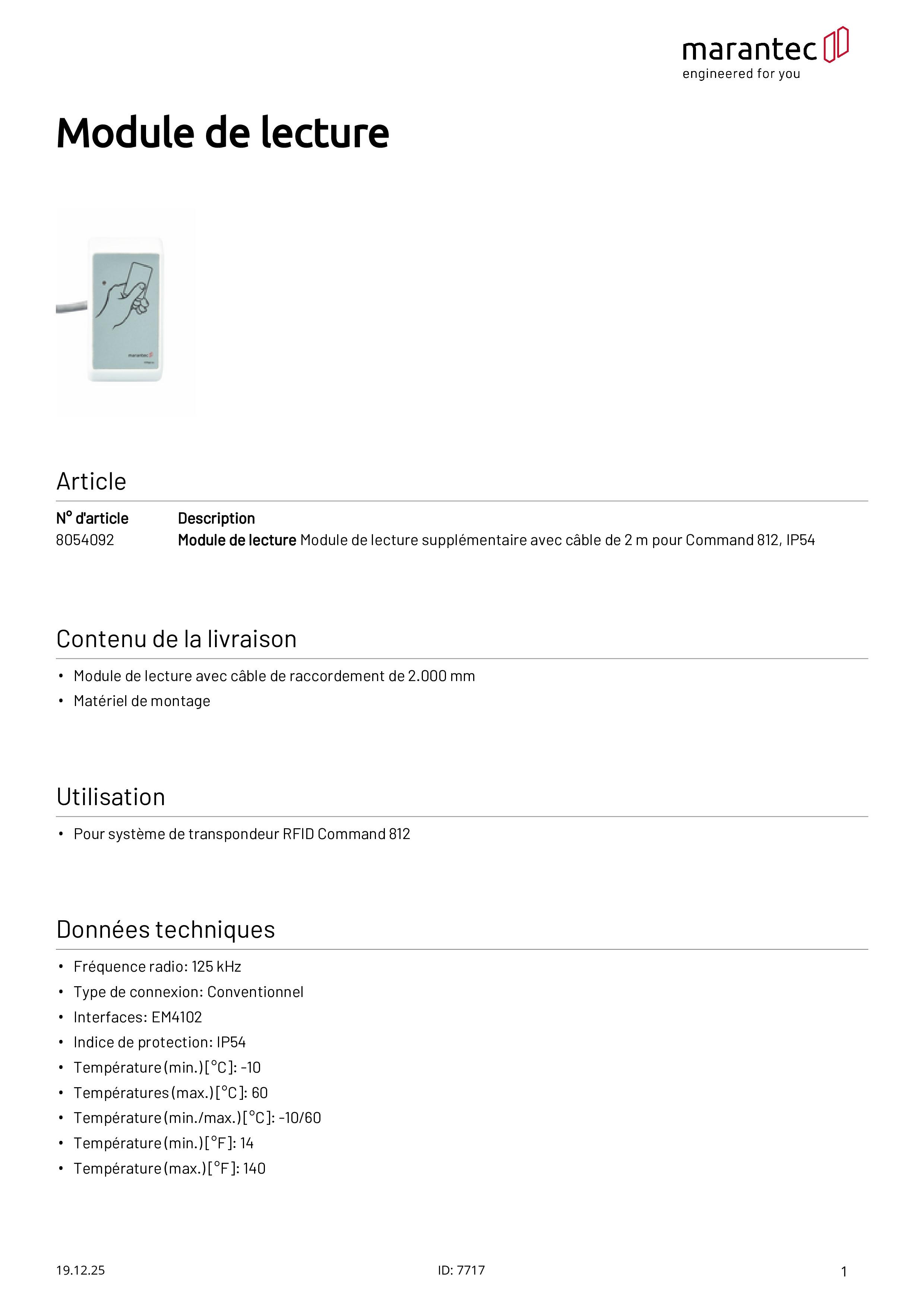 Module de lecture avec câble de 2 m pour Command 812