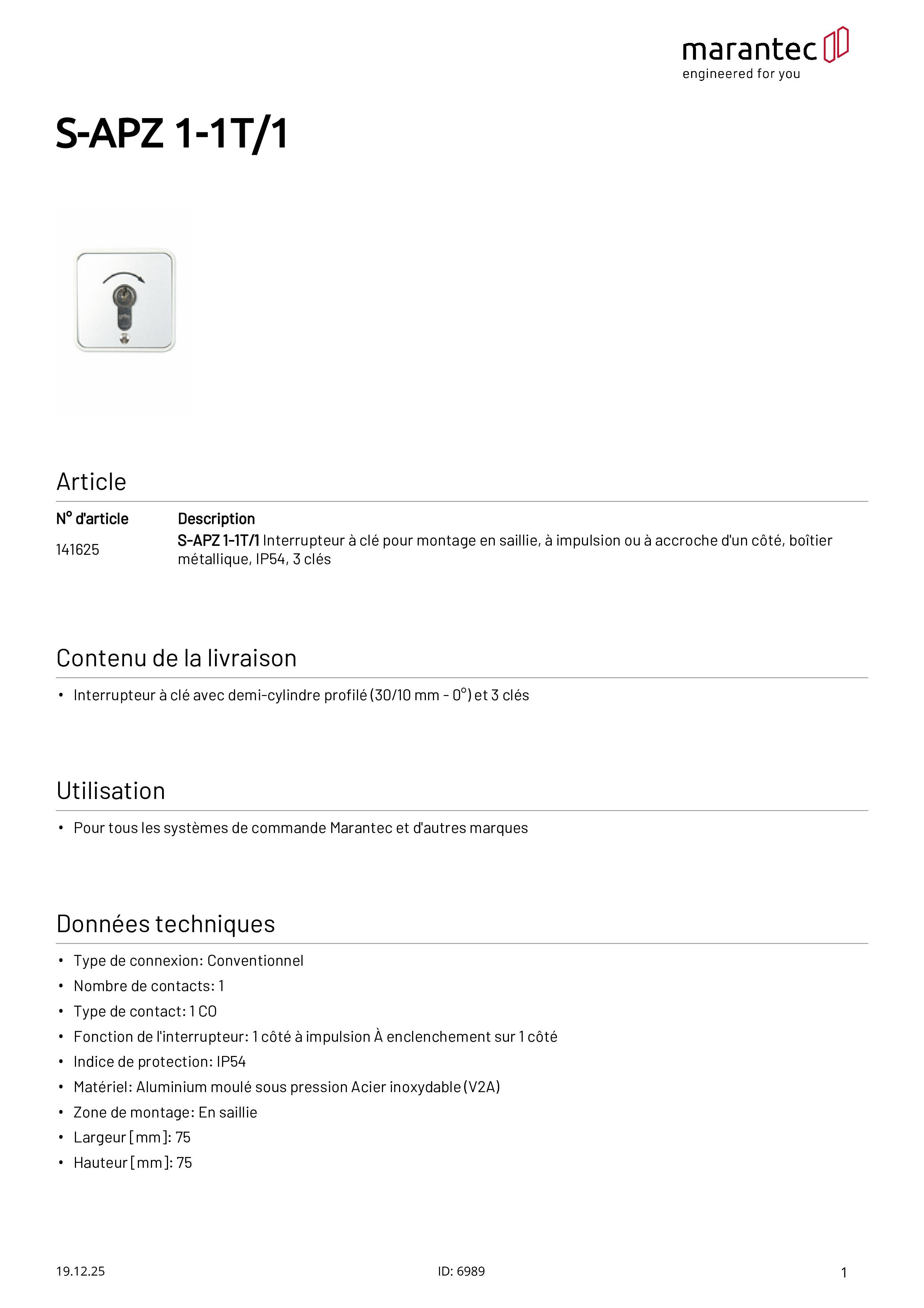 - Interrupteur à clé avec demi-cylindre profilé (30/10 mm - 0°) et 3 clés