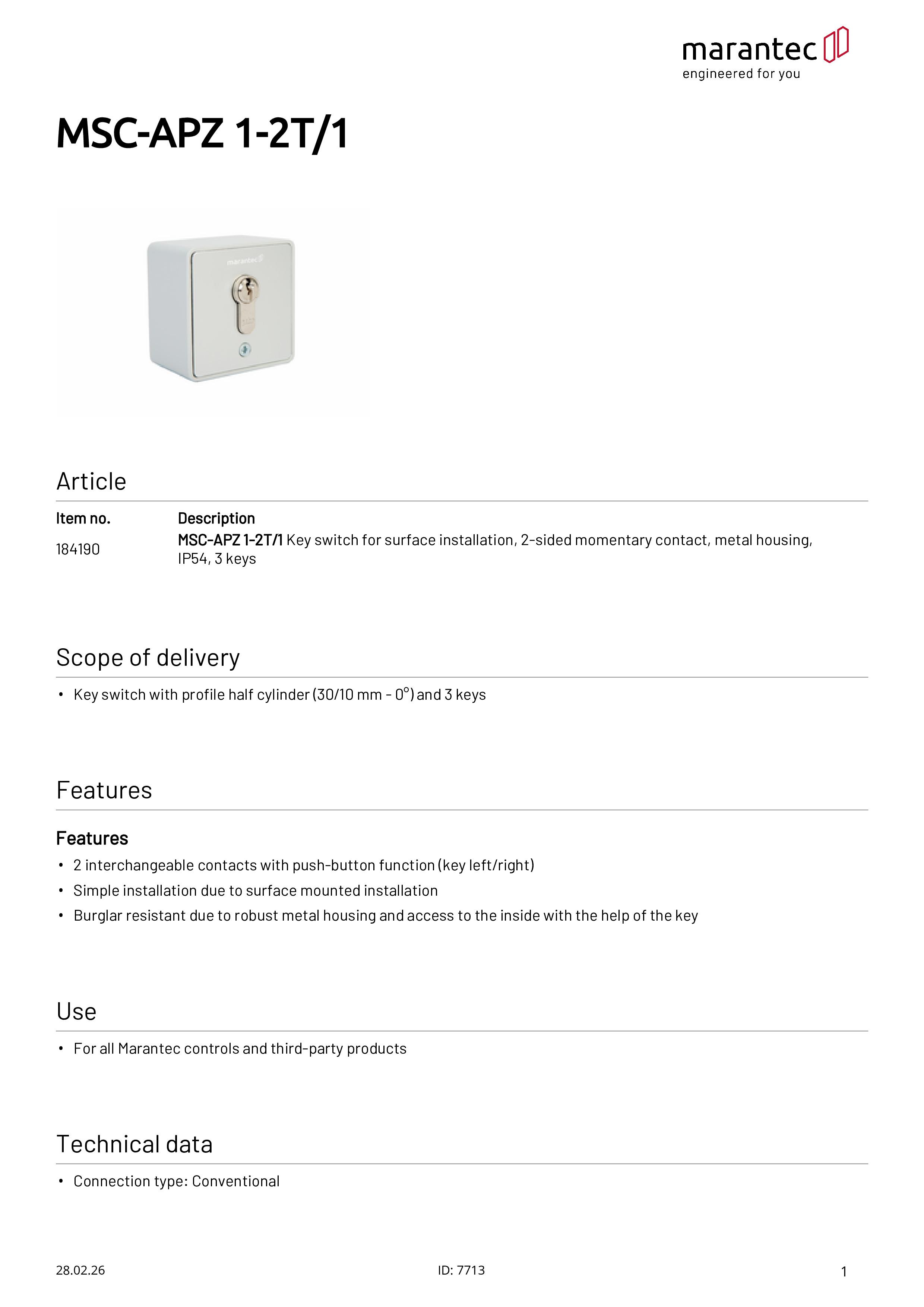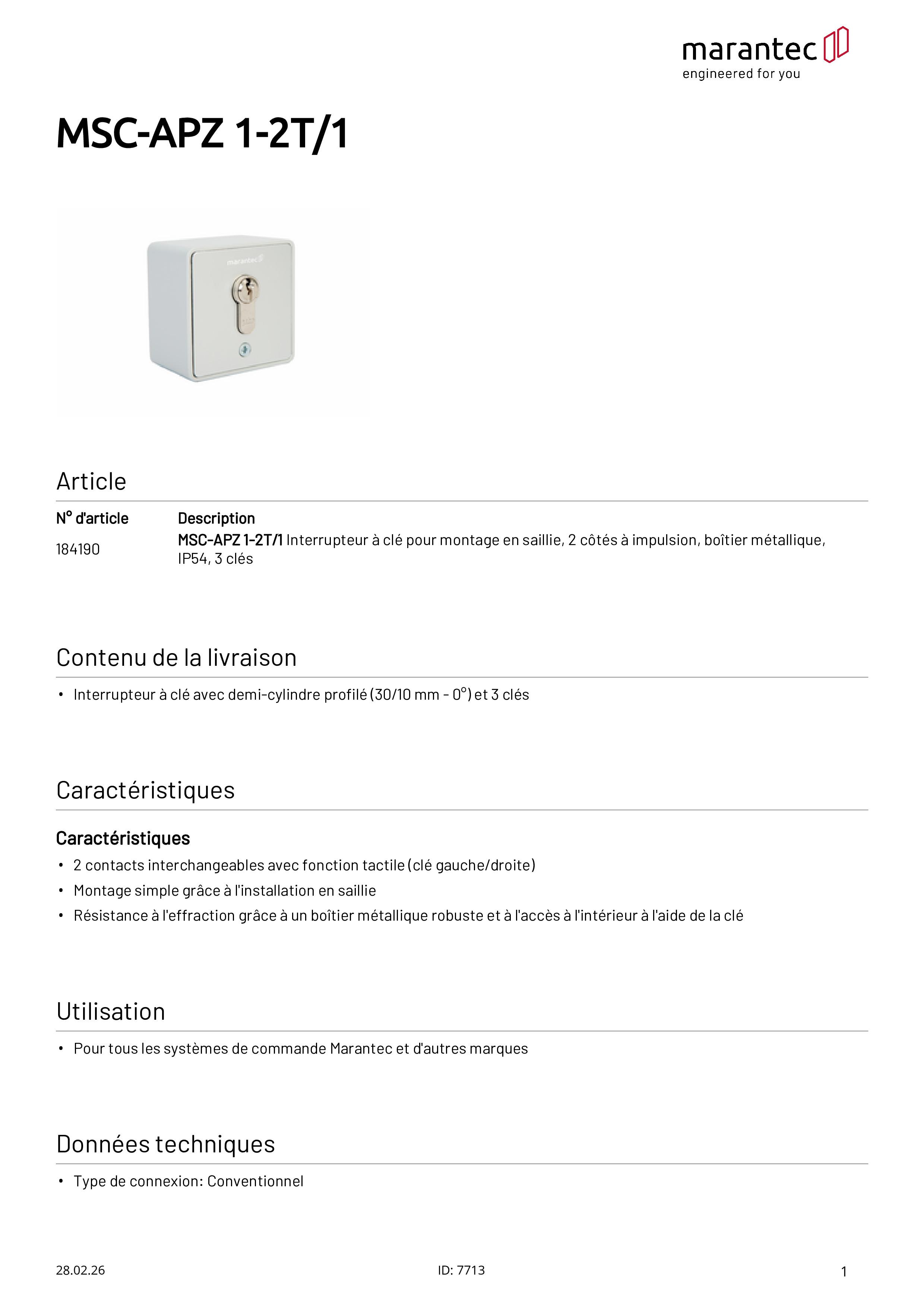MSC-APZ 1-2T/1 Interrupteur à clé pour montage en saillie, à bouton-poussoir de 2 côtés