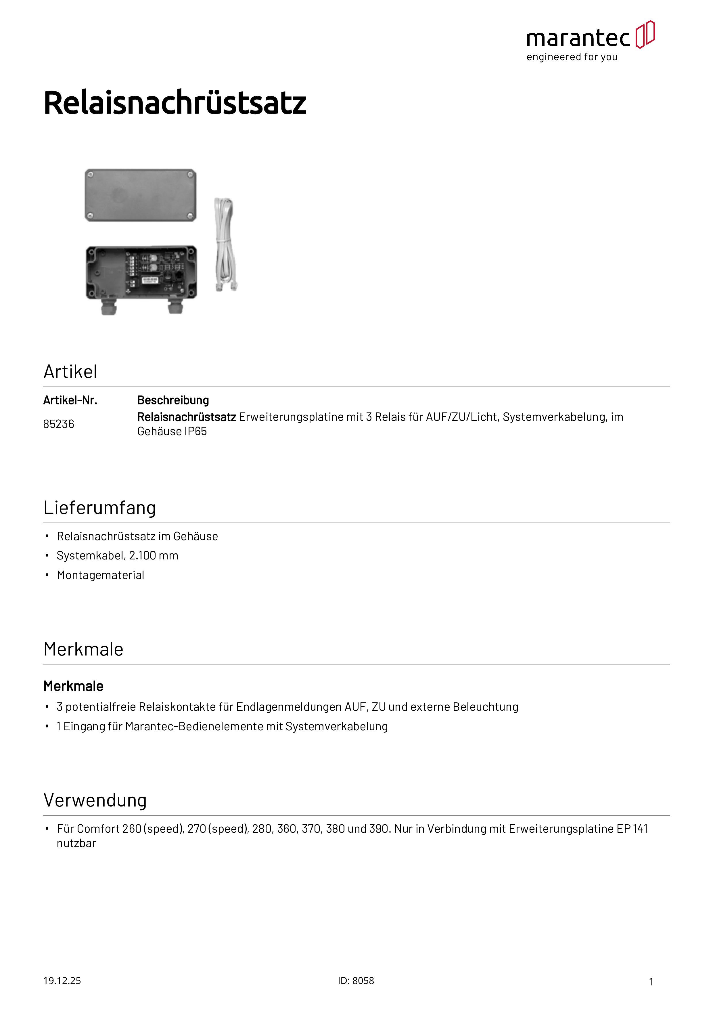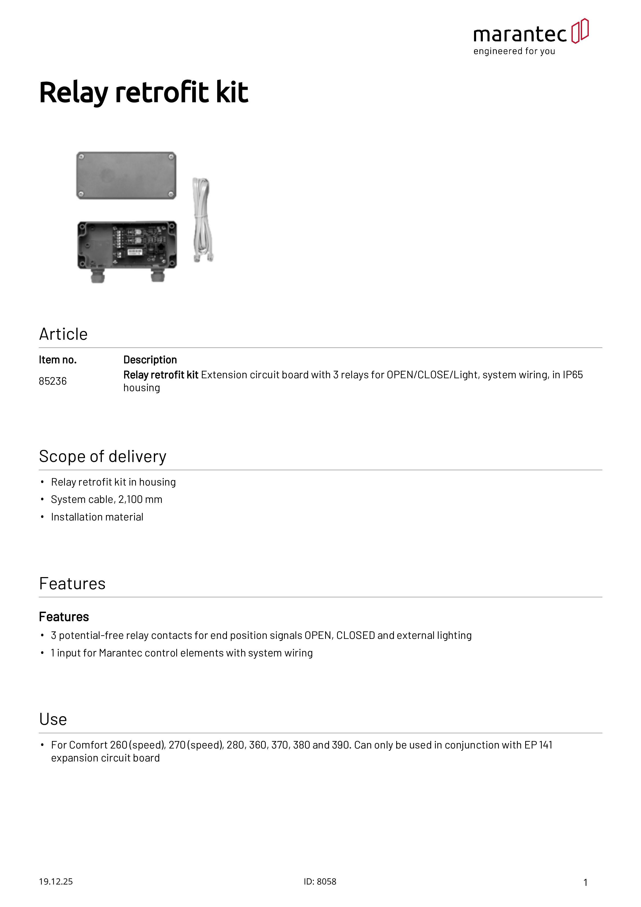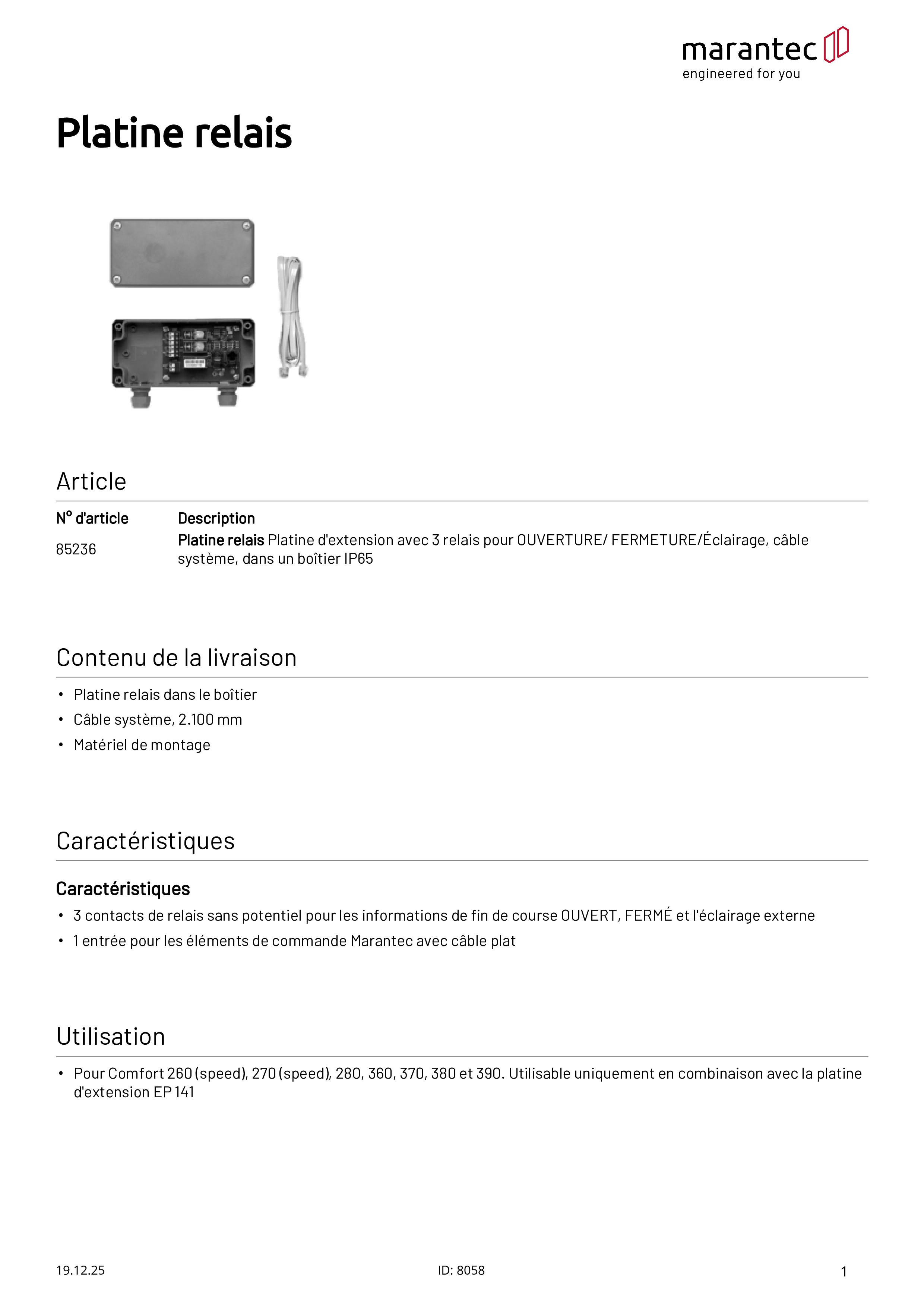 - 1 entrée pour les éléments de commande Marantec avec câble plat