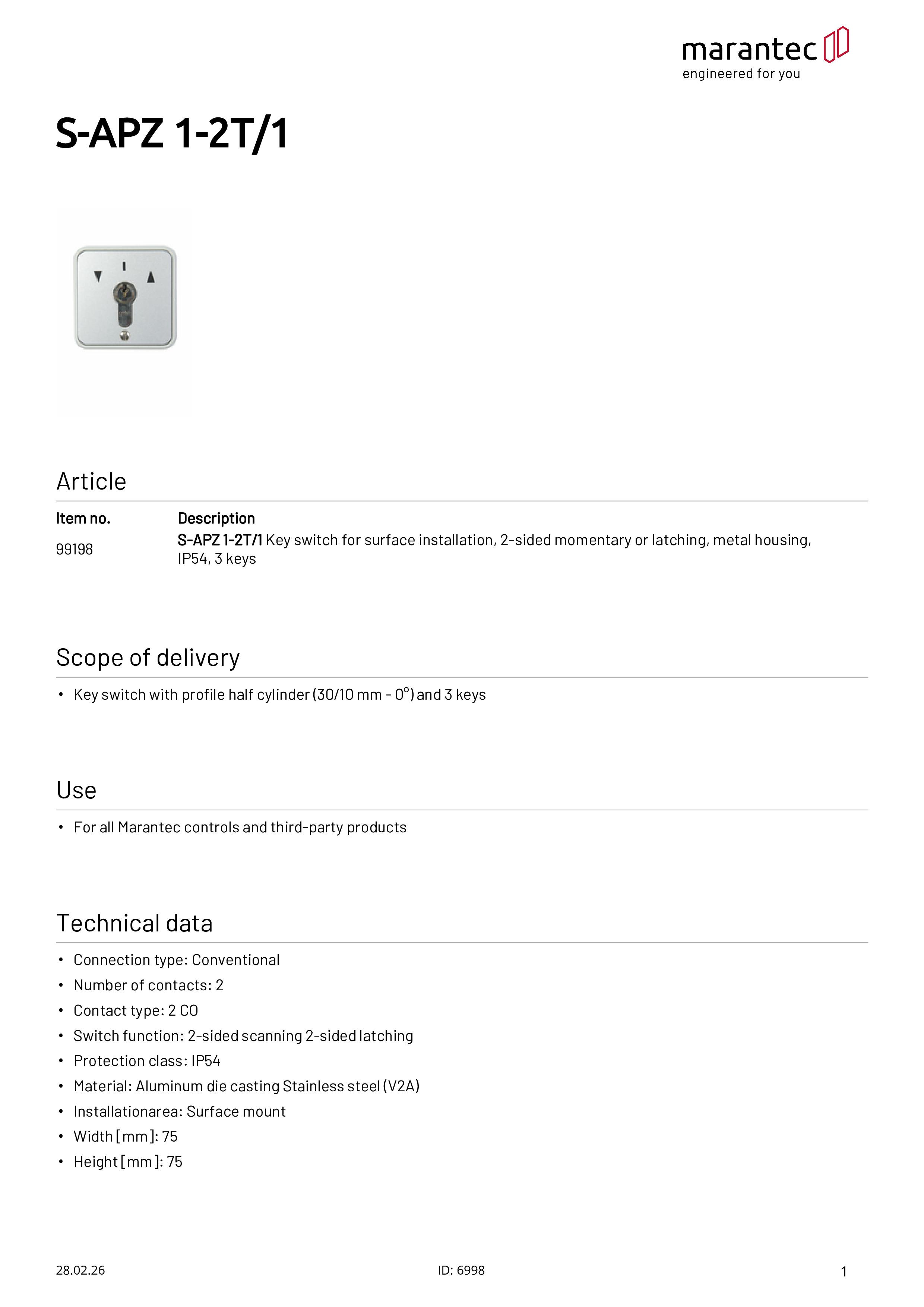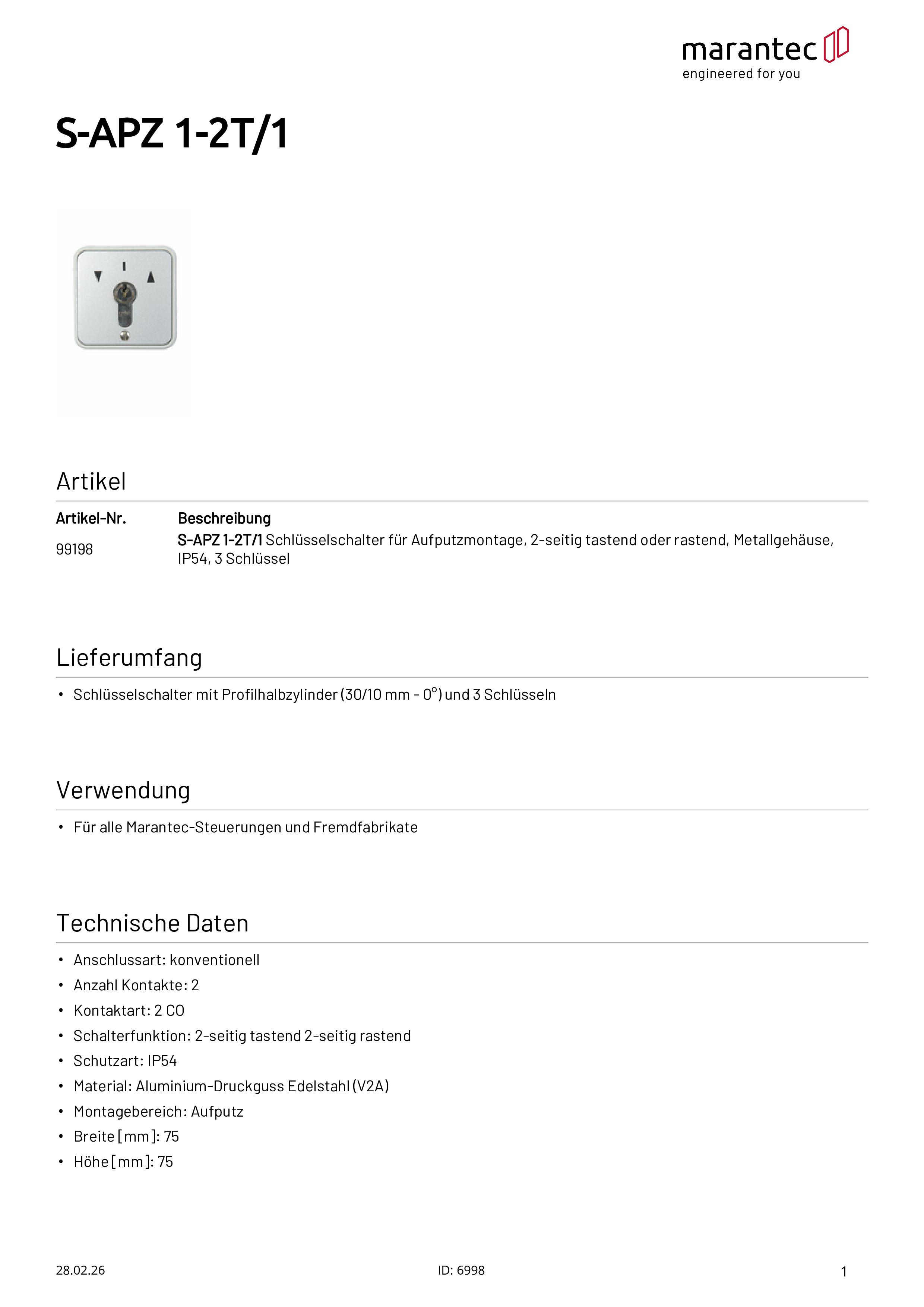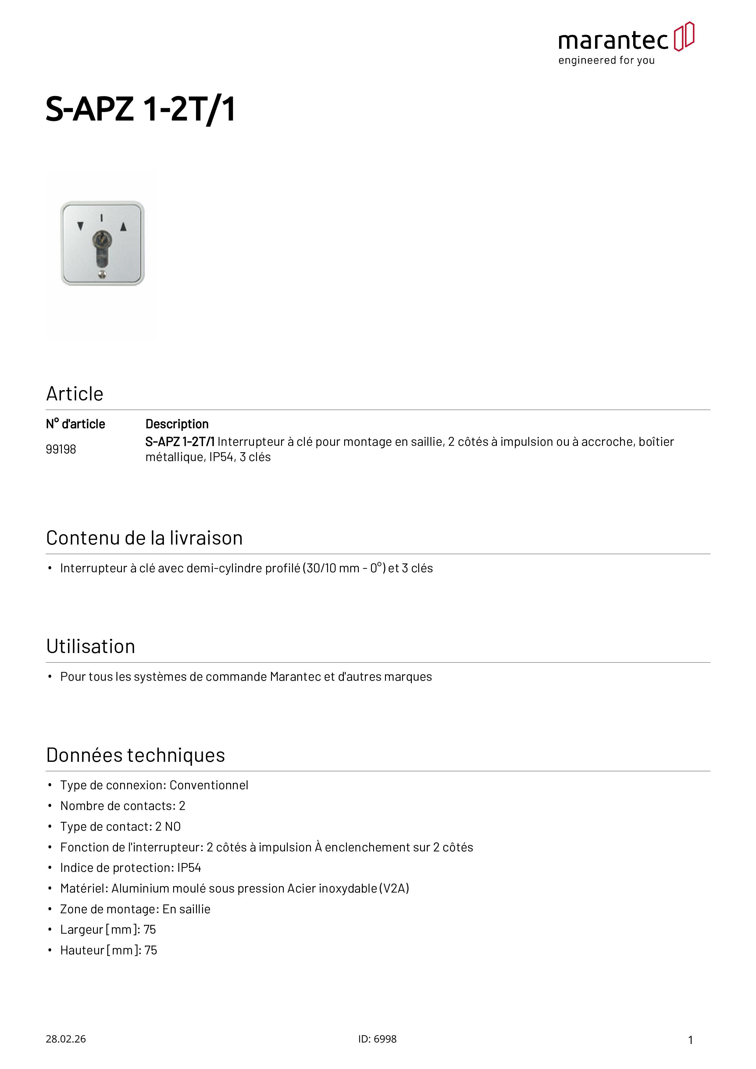 S-APZ 1-2T/1 Interrupteur à clé pour montage en saillie 2 côtés à impulsion/à accroche