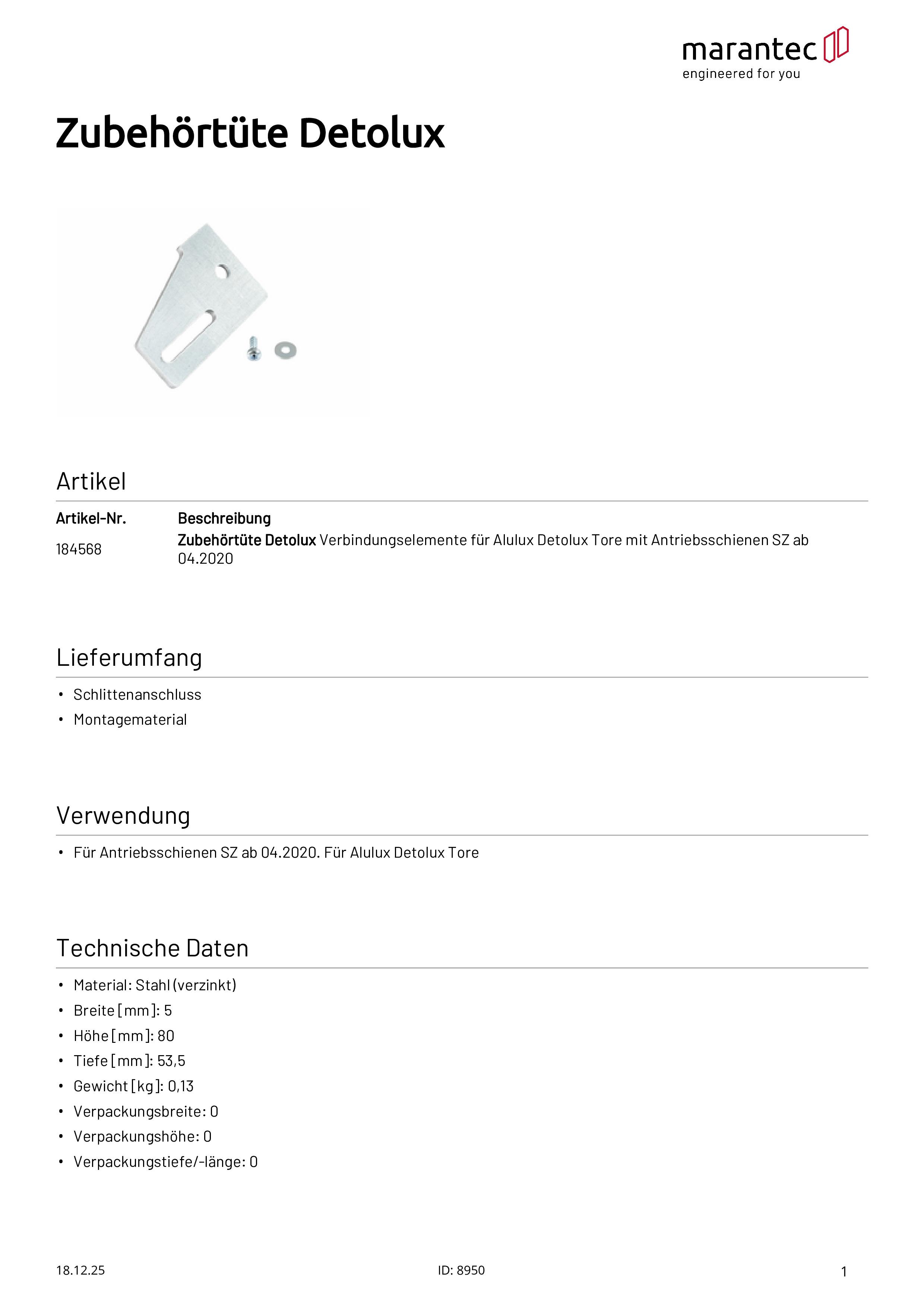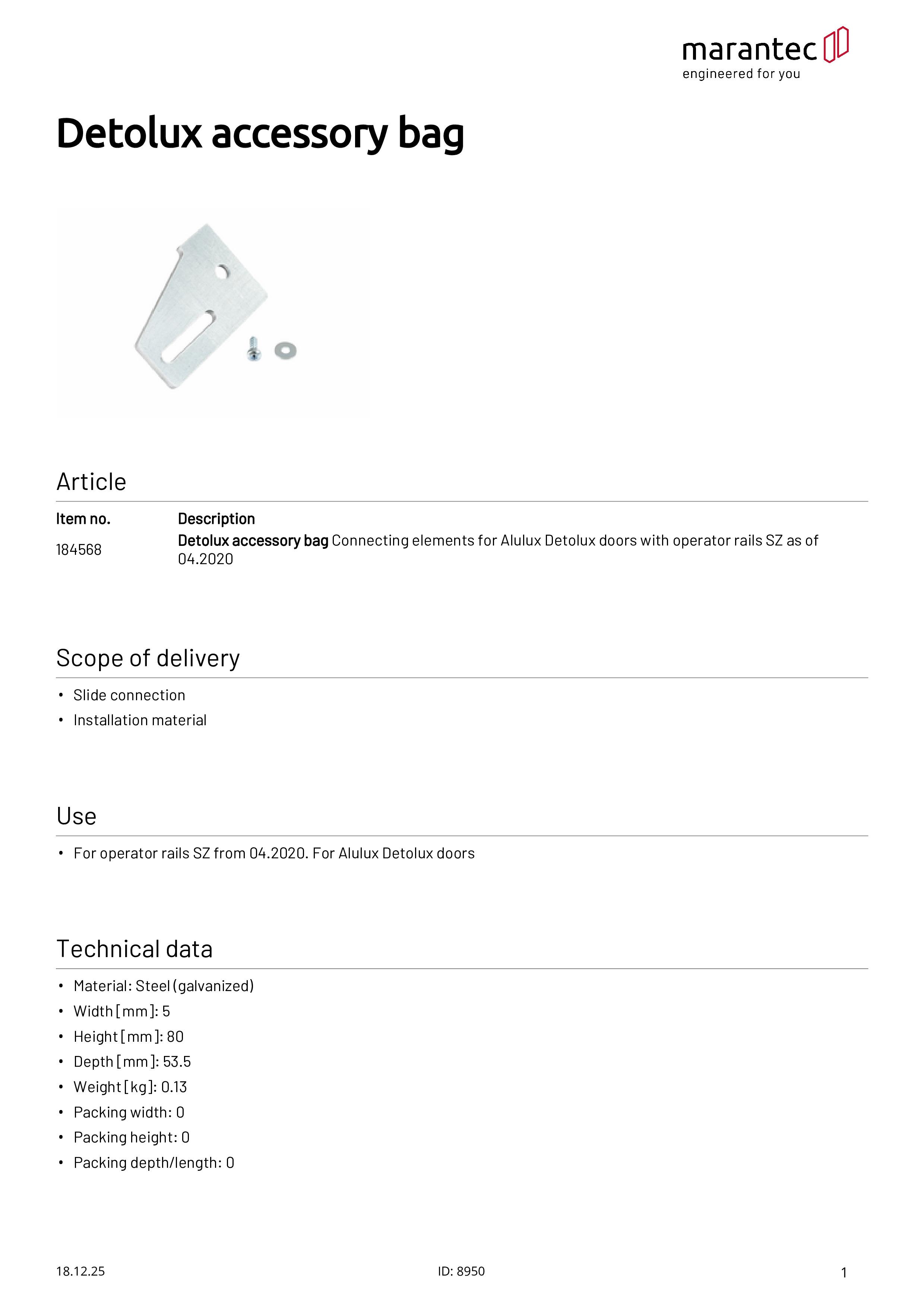 Sachet d'accessoires pour portes Alulux Detolux avec rails d'entraînement SZ à partir de 04.2020