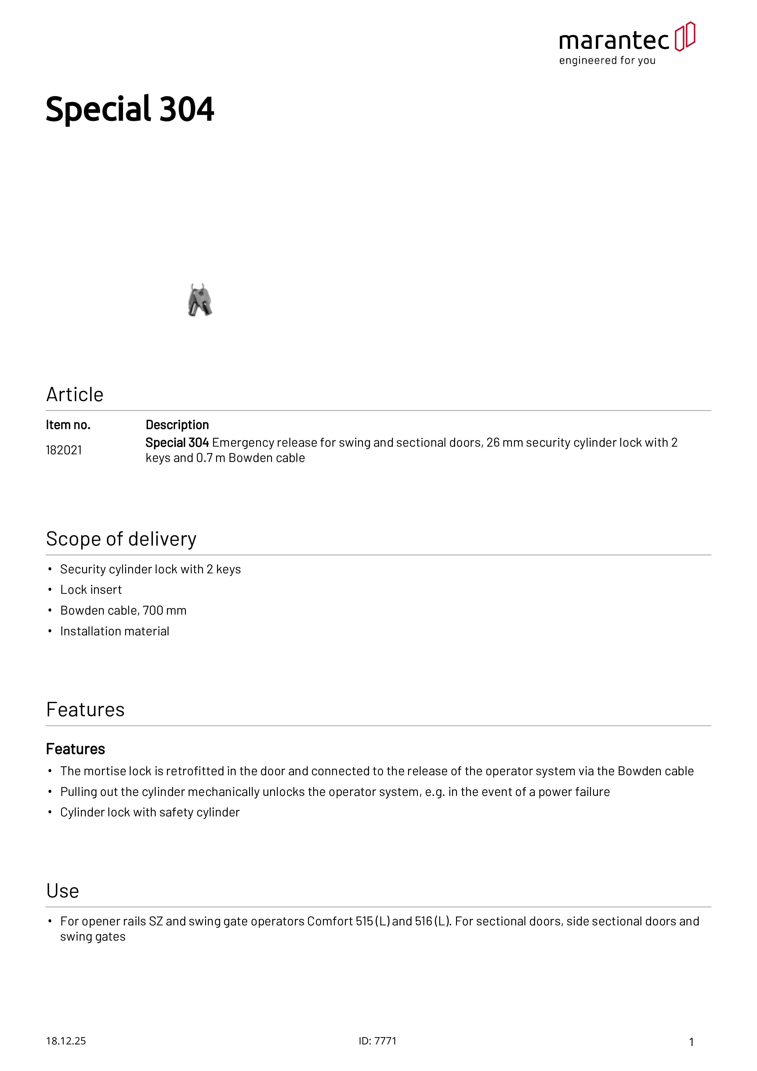 Special 304 Déverrouillage d'urgence pour portes battantes/ sectionnelles avec câble Bowden de 0,7 m