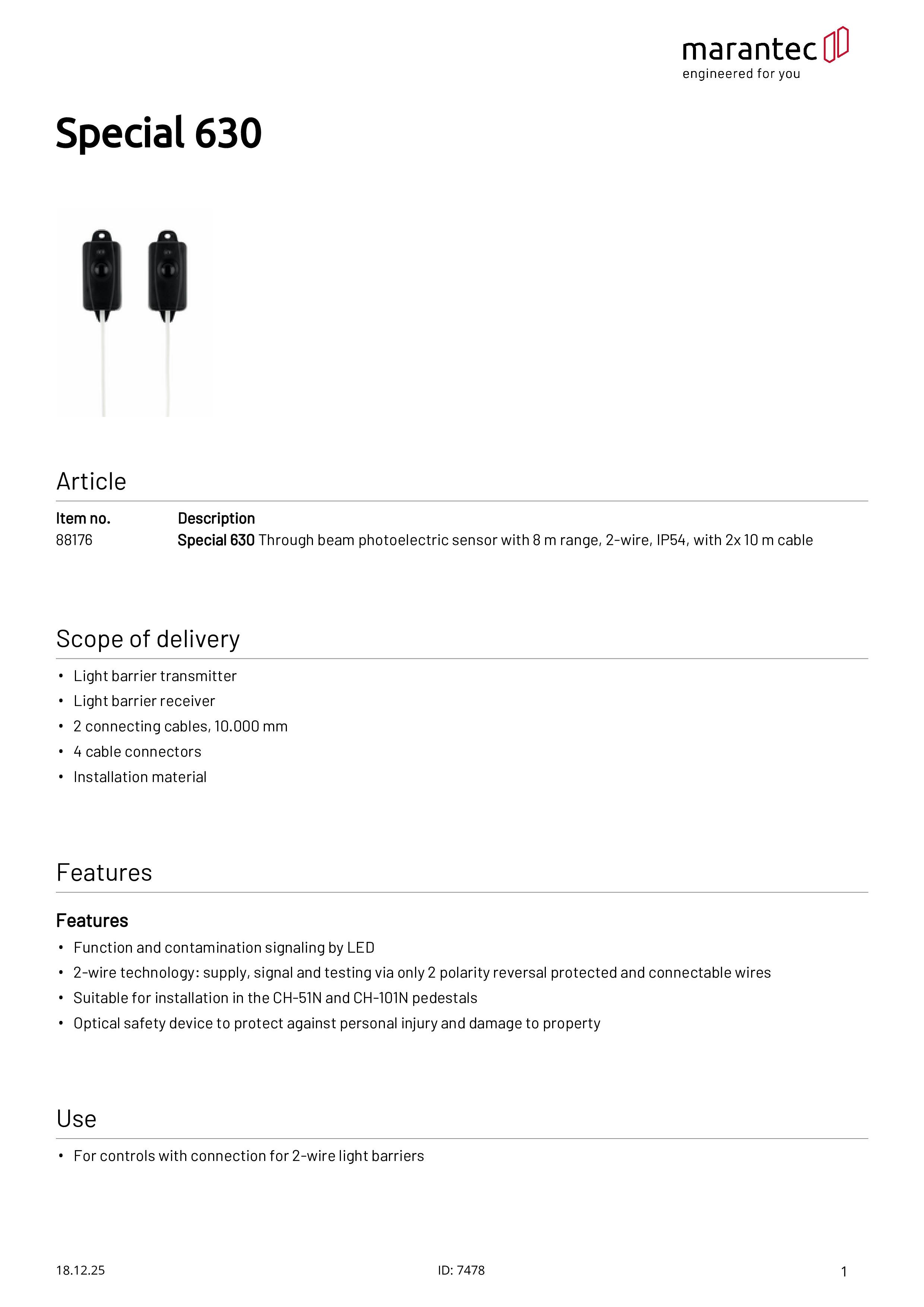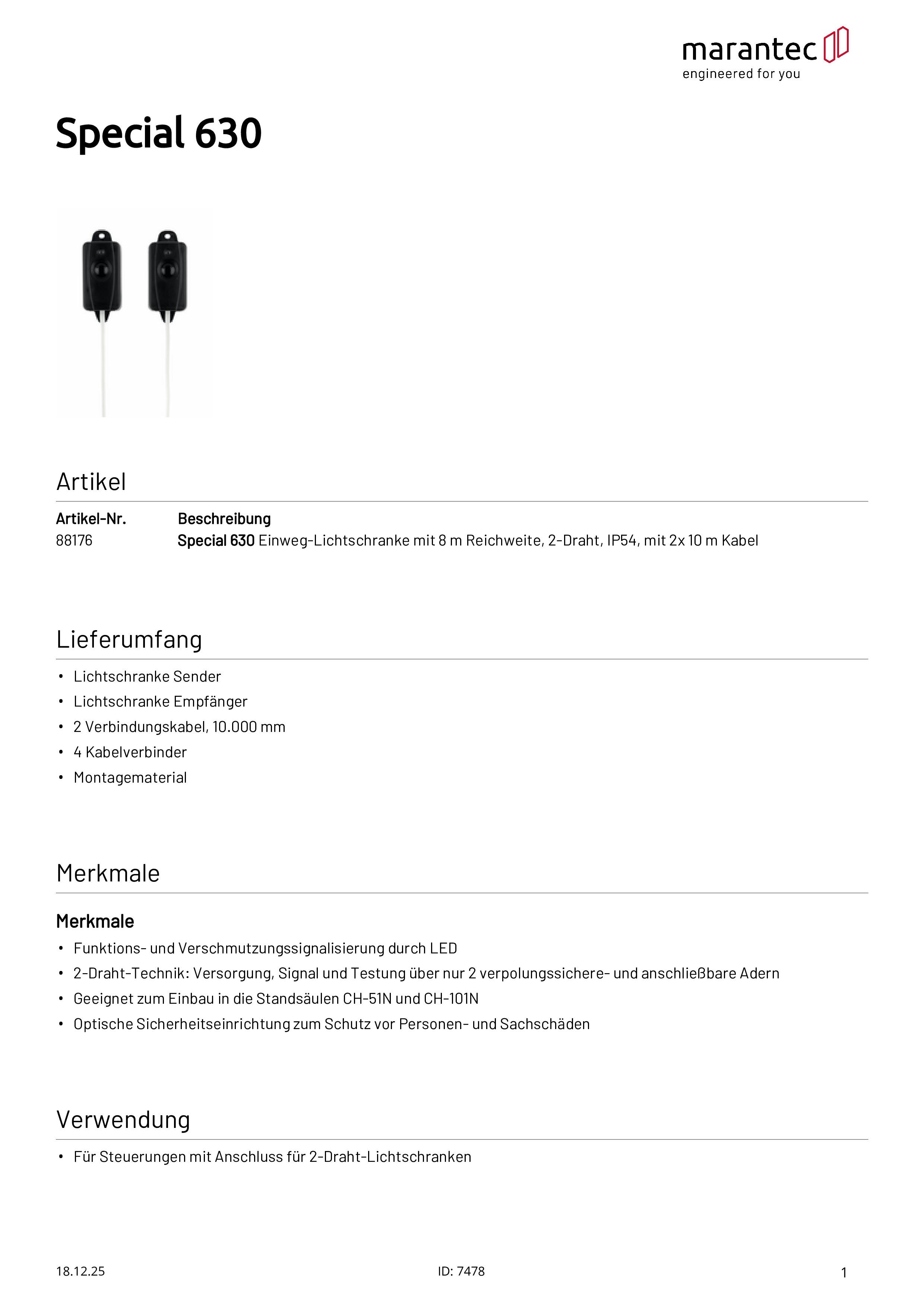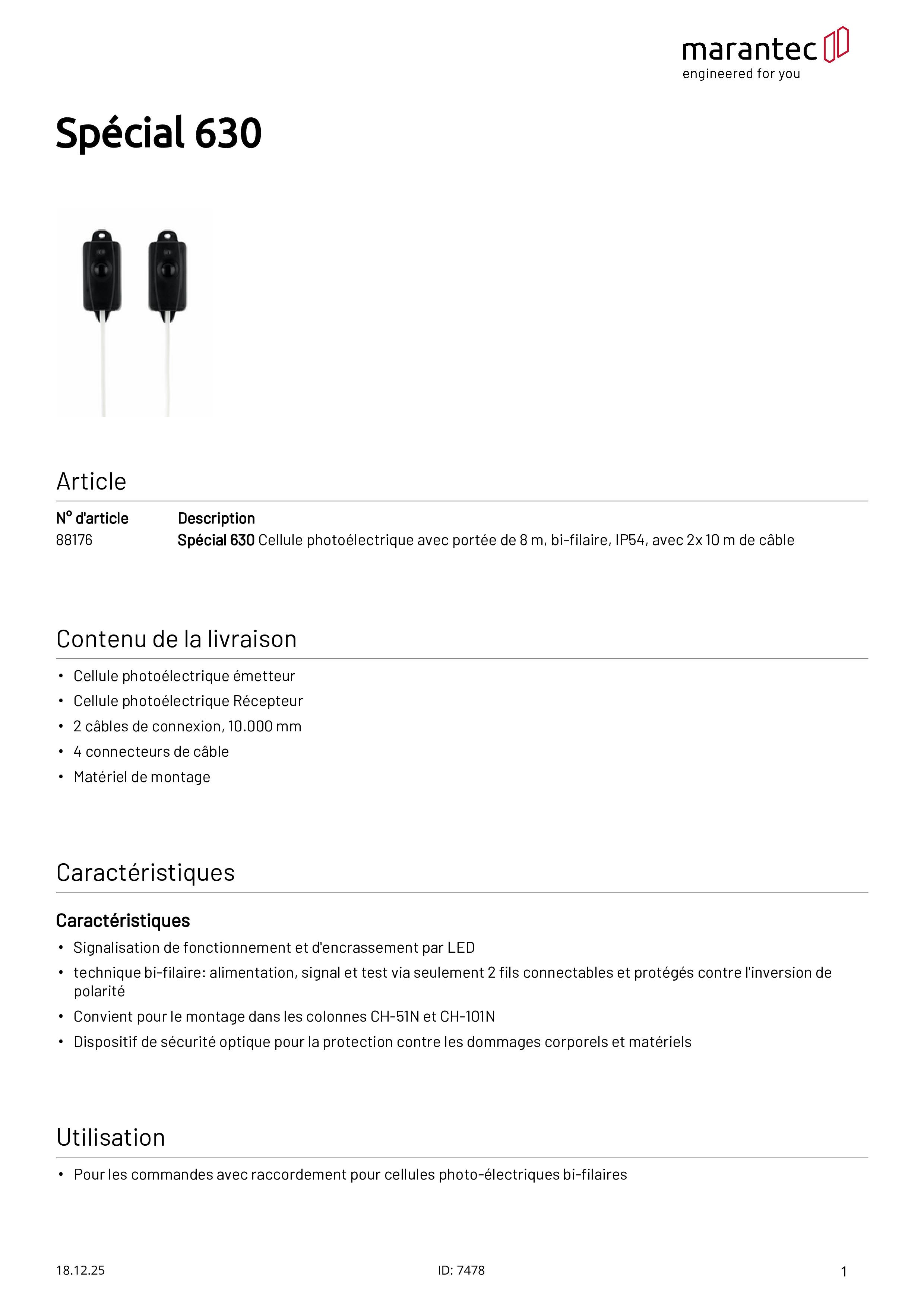 Special 630 Cellule photoélectrique portée 8m, bifilaire, 2x 10 m de câble