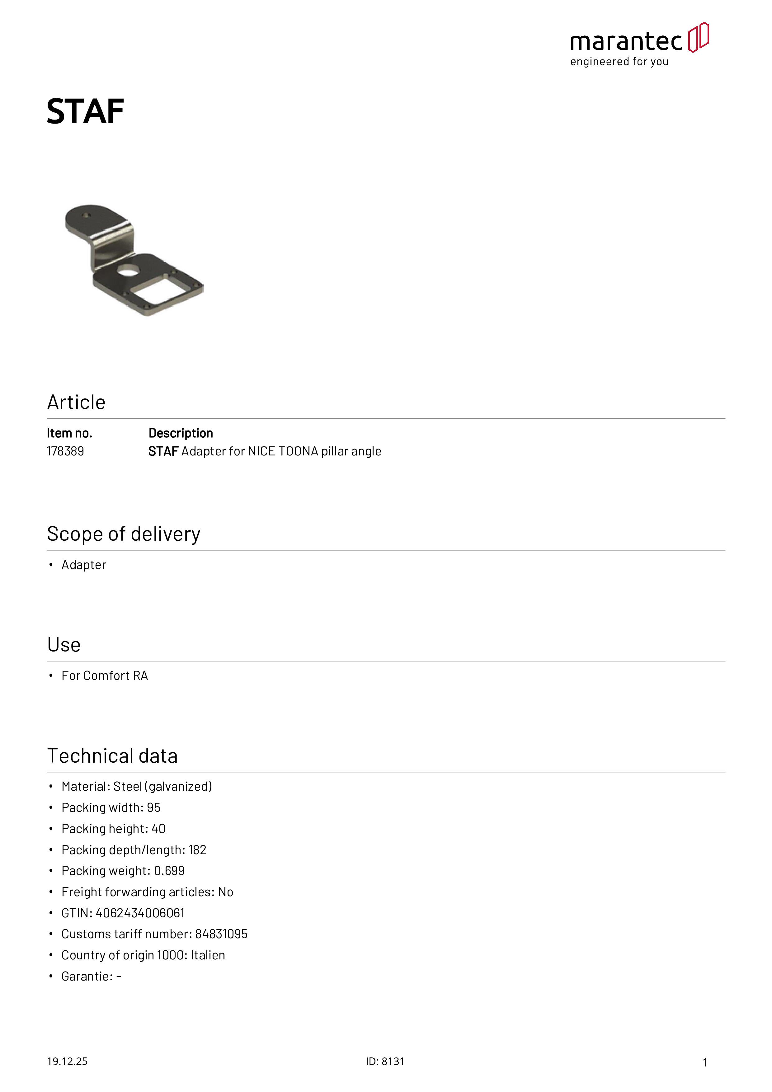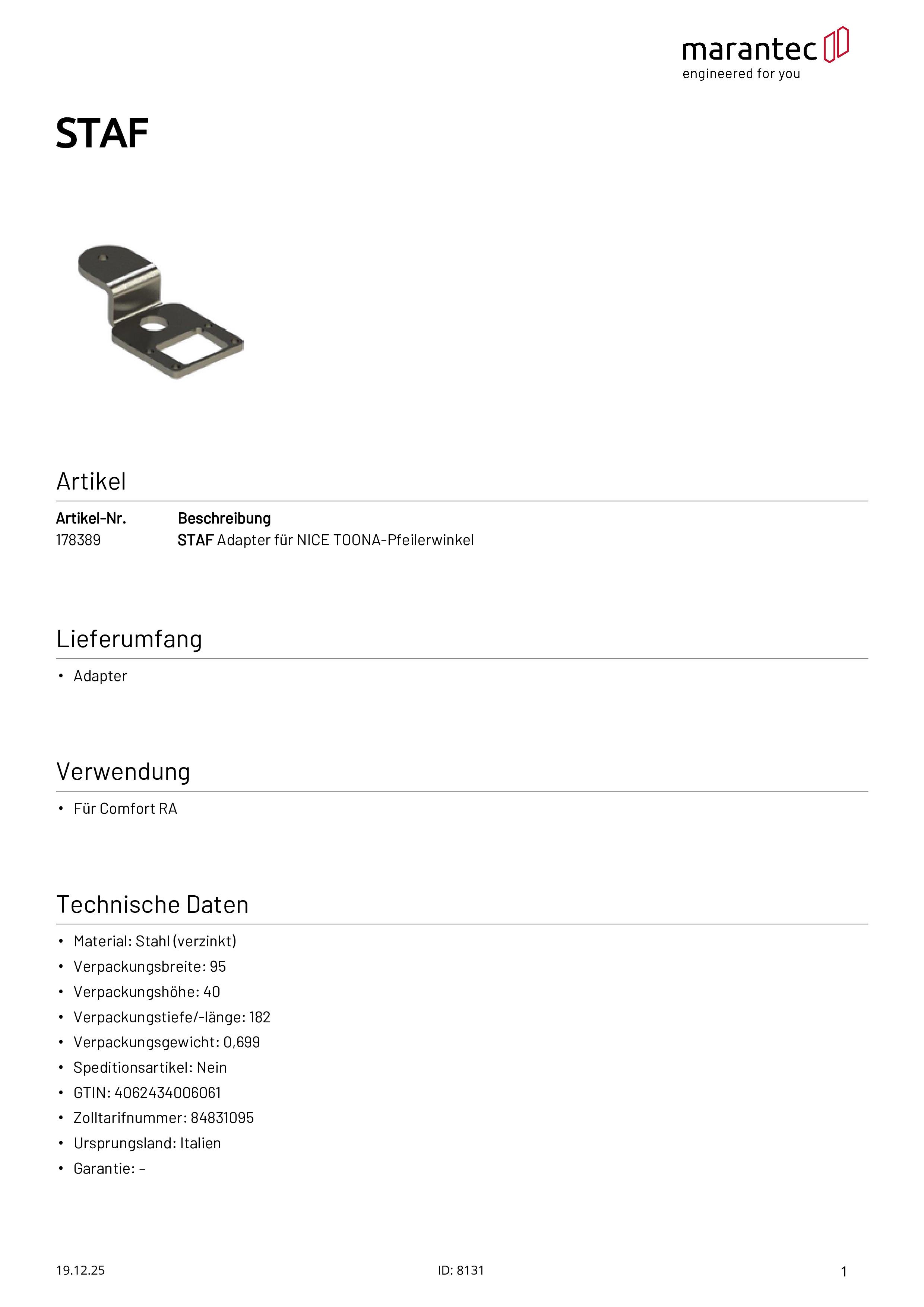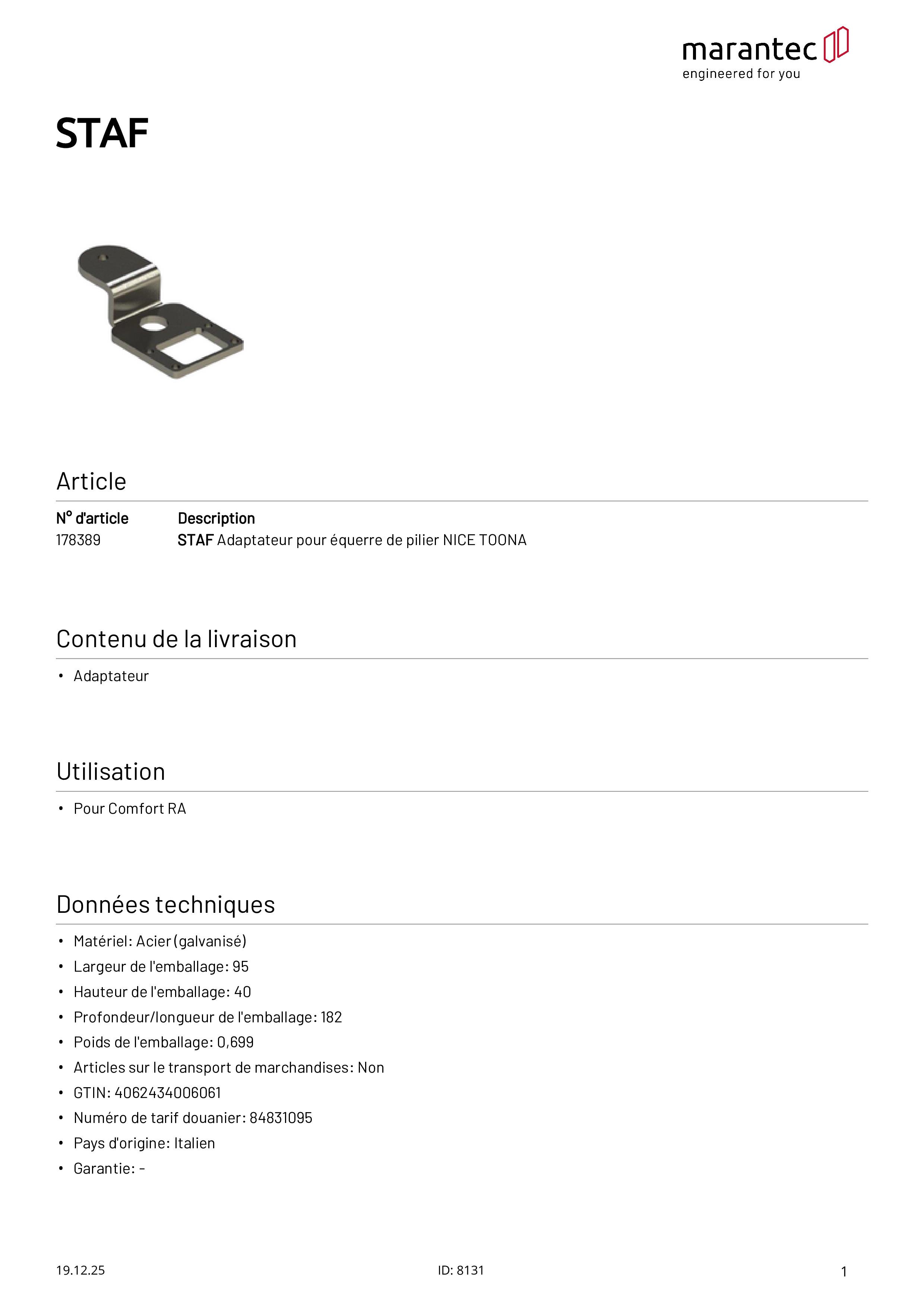 STAF Adaptateur pour équerre NICE TOONA pour Comfort RA
