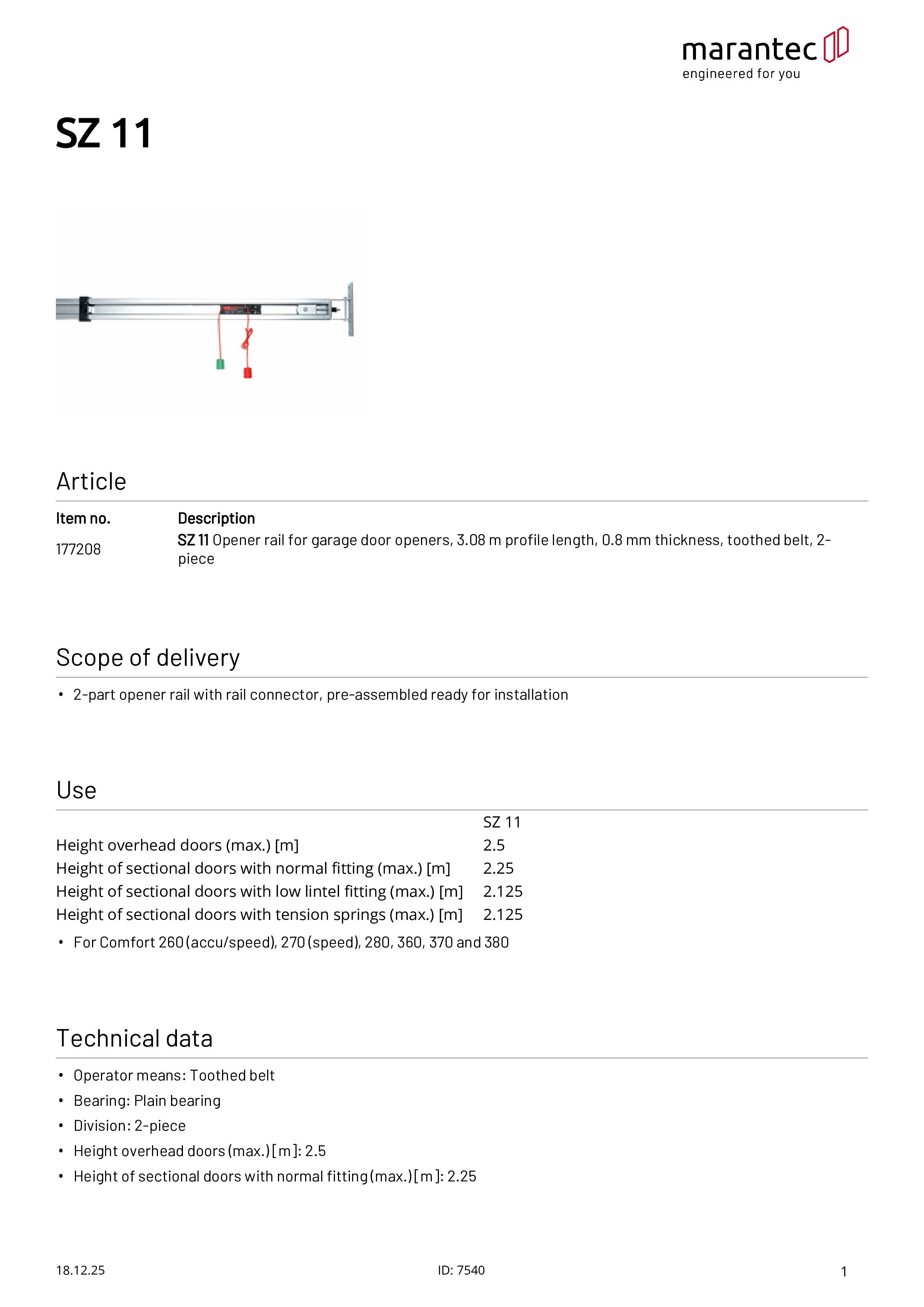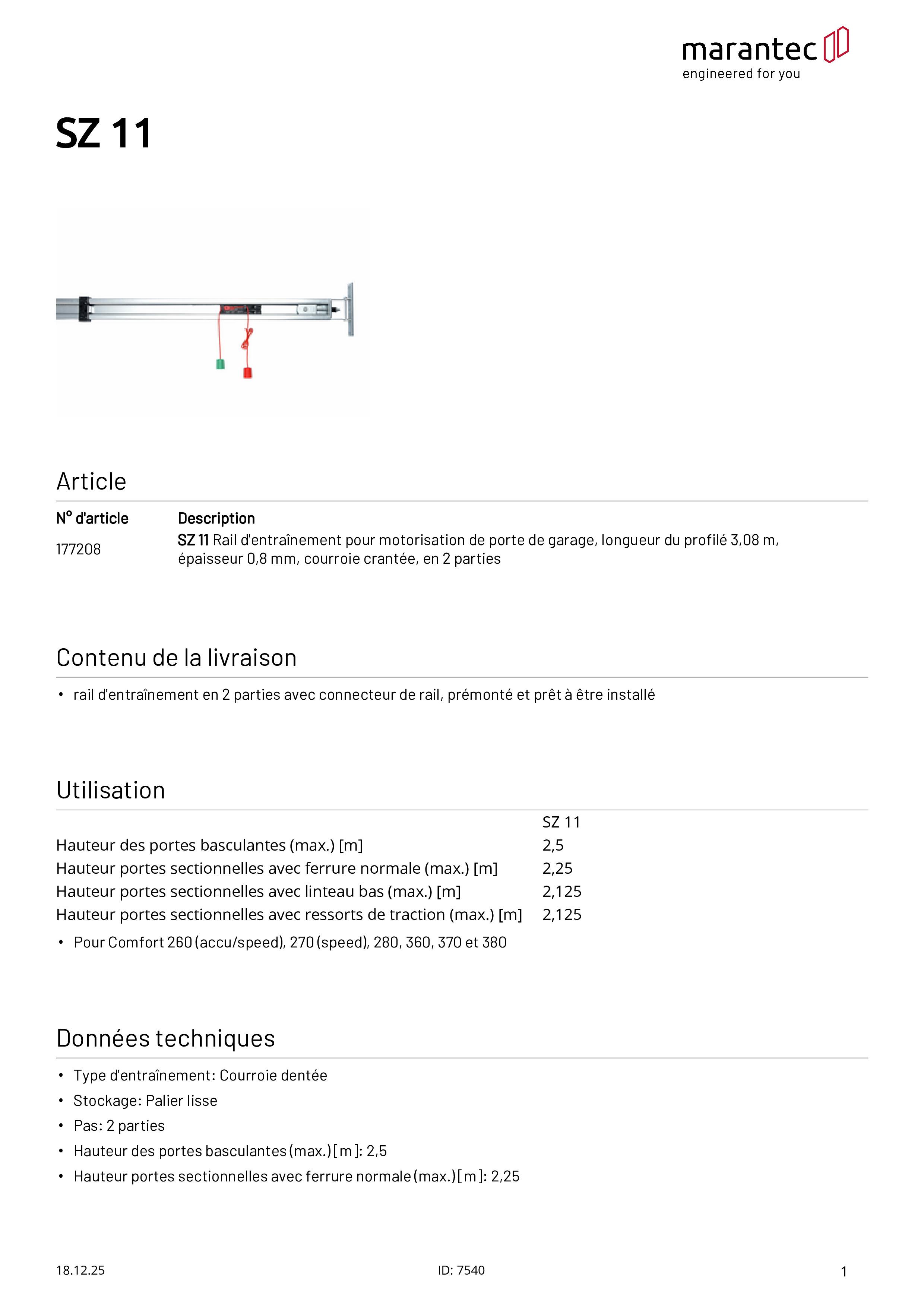 SZ 11 Rail d'entraînement en 2 parties Longueur du profilé 3.080 mm Épaisseur 0,8 mm