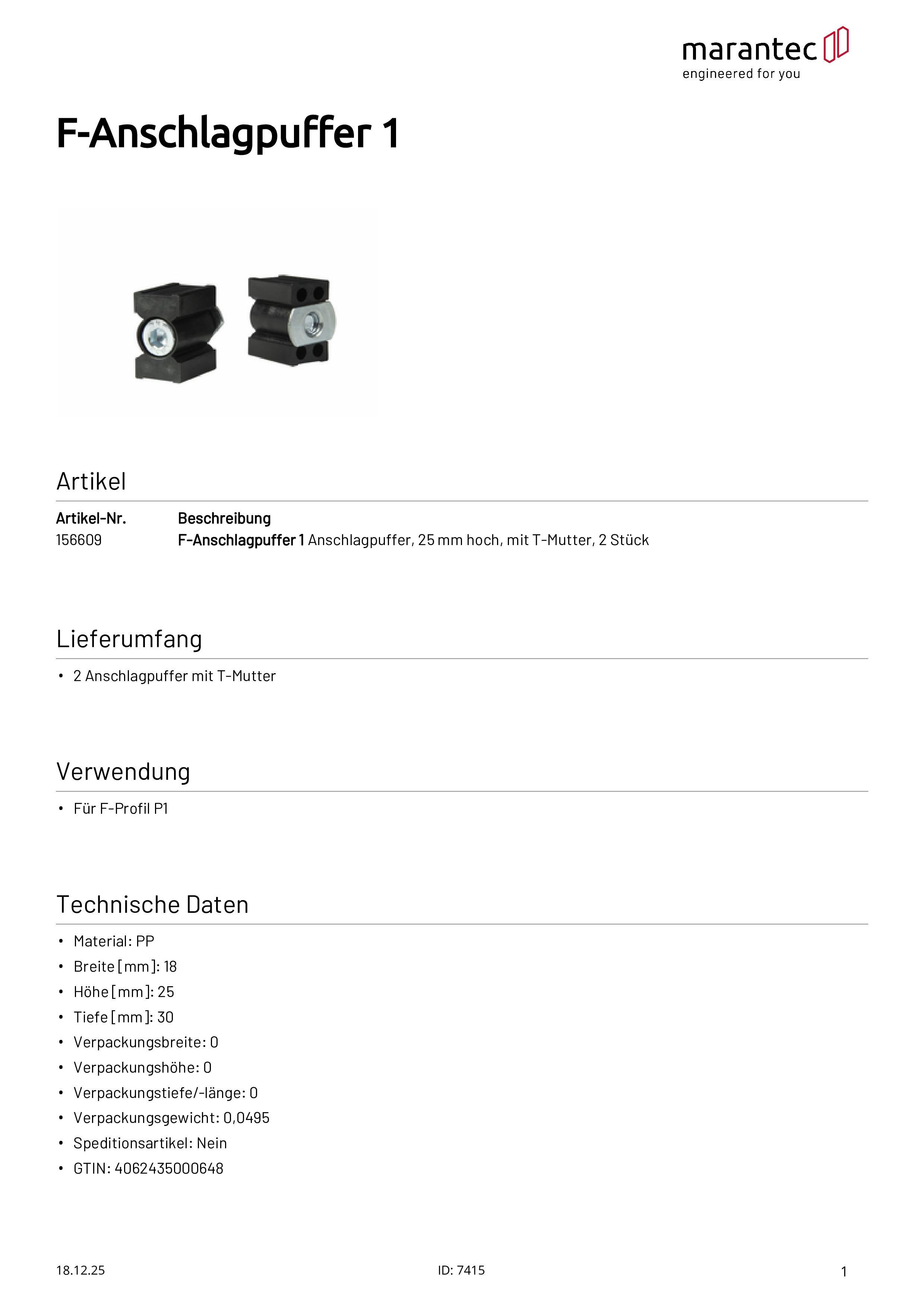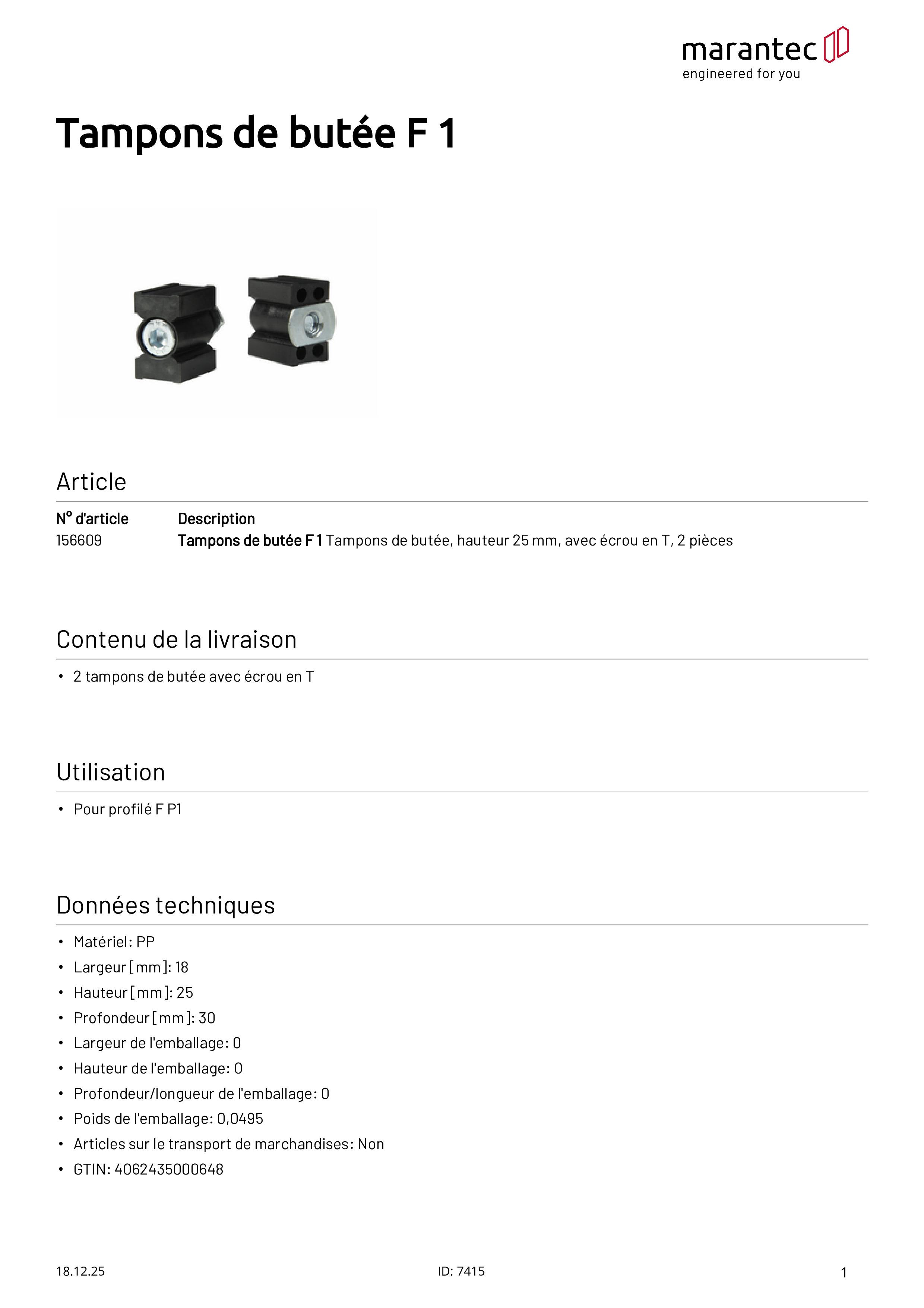 Tampon de butée F 1, hauteur 25 mm, avec écrou en T, lot de 2