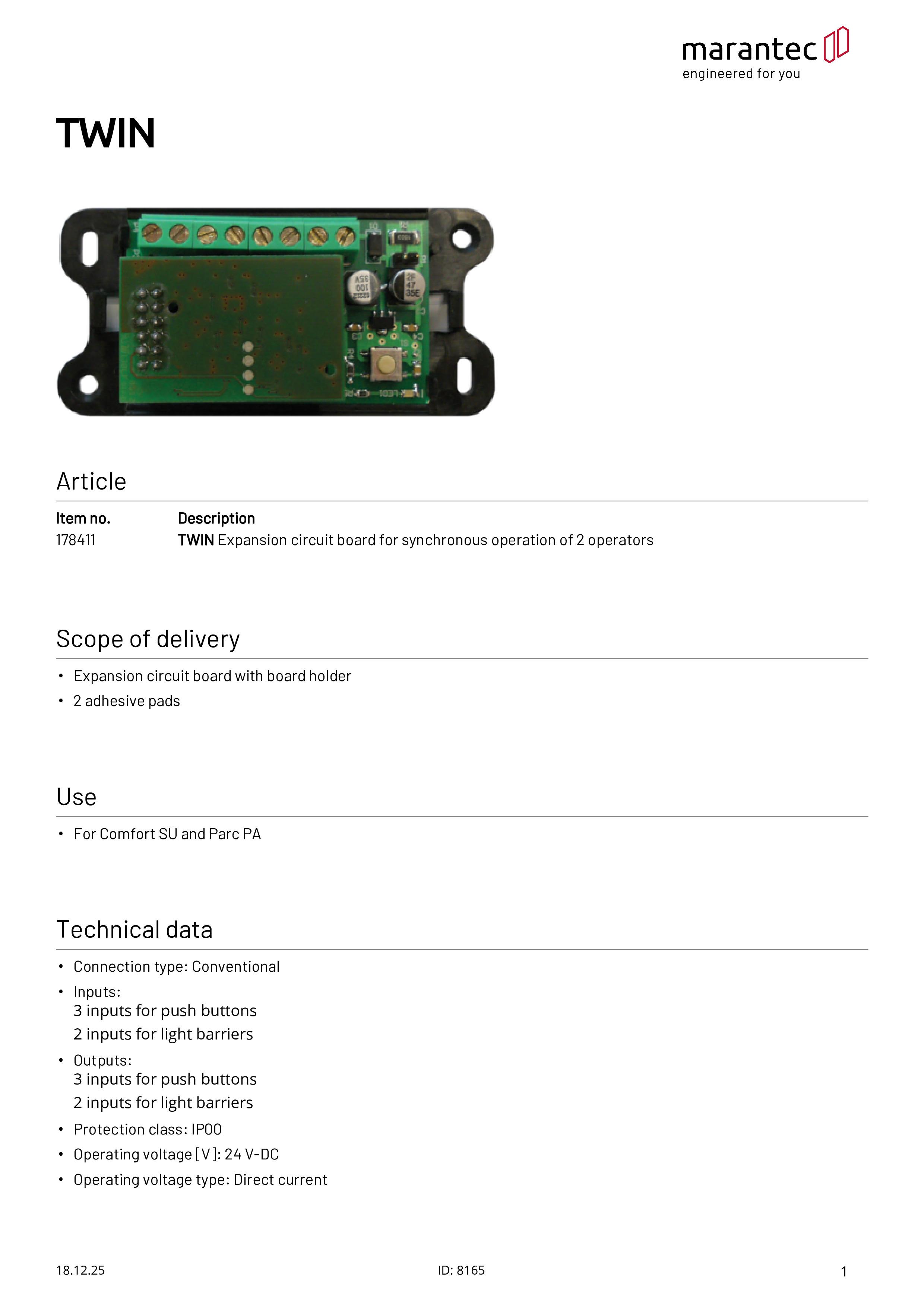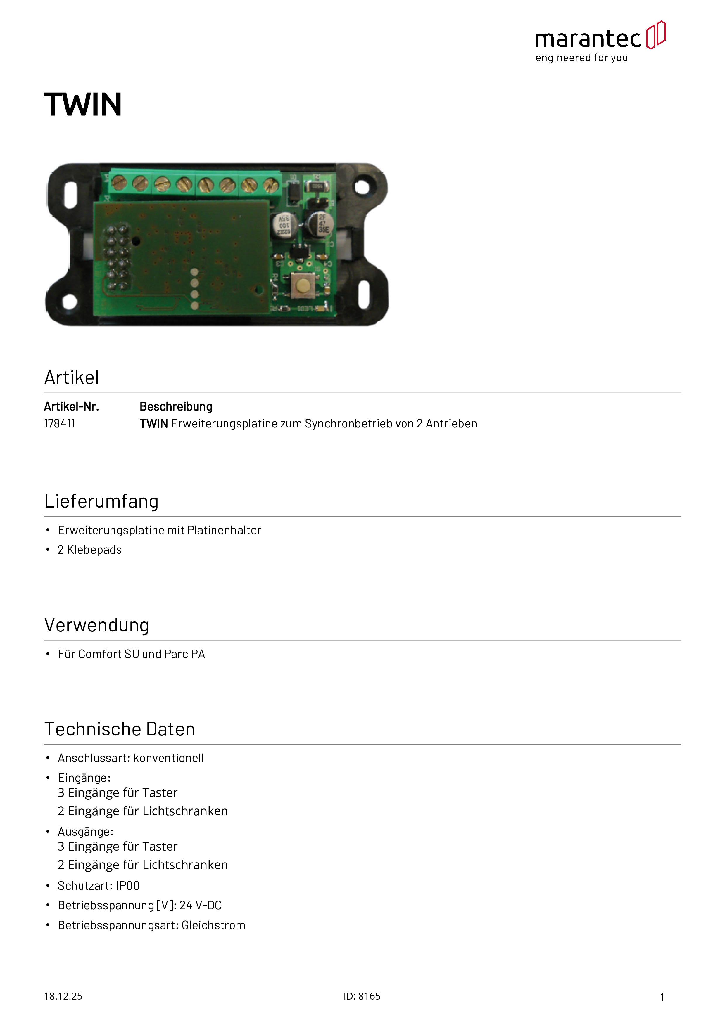 Platine d'extension TWIN pour le fonctionnement synchrone de deux motorisations